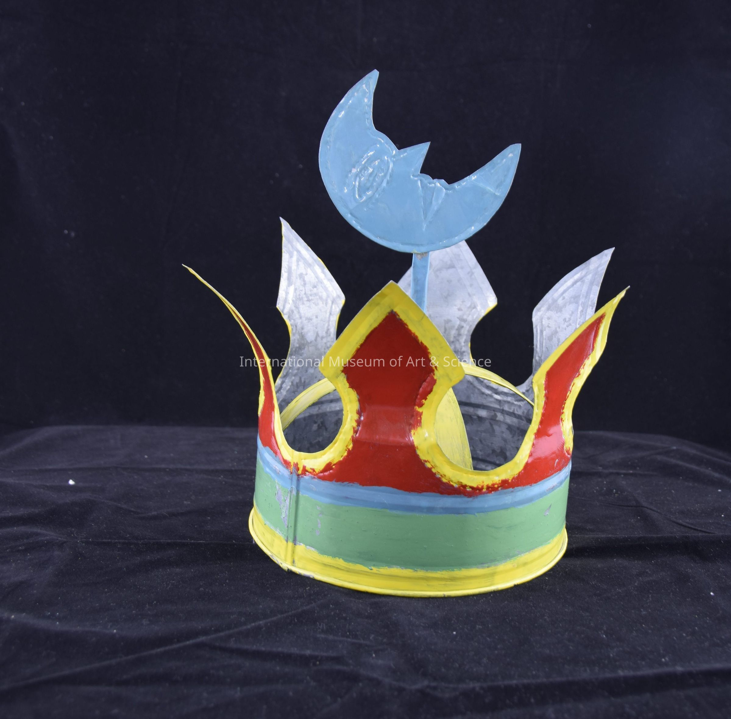 Crown. Crown from the dance of the Christians and Moors; tin crown painted with green and blue bands; red and yellow scalloped forms; blue central moon top.Dimensions