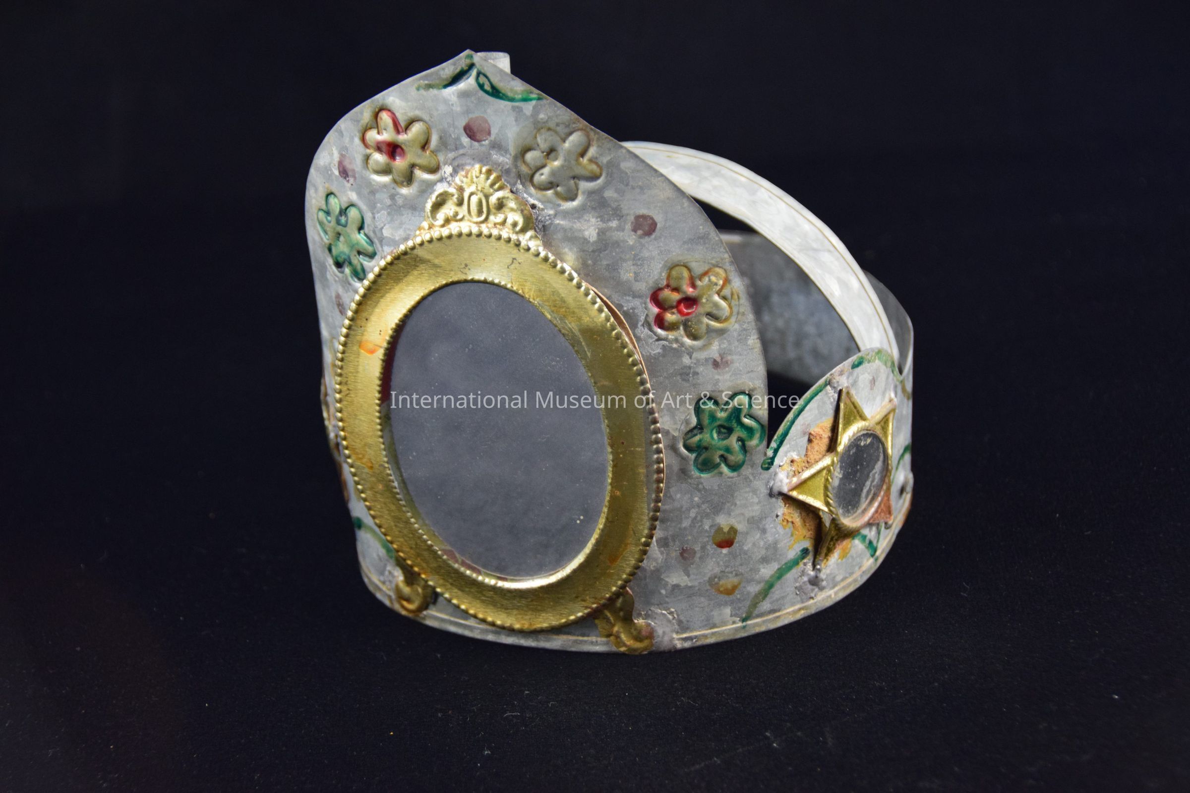 A tin crown with an oval mirror in front outlined with gold oval tin. "Felip Moreno" is written on the curved band.