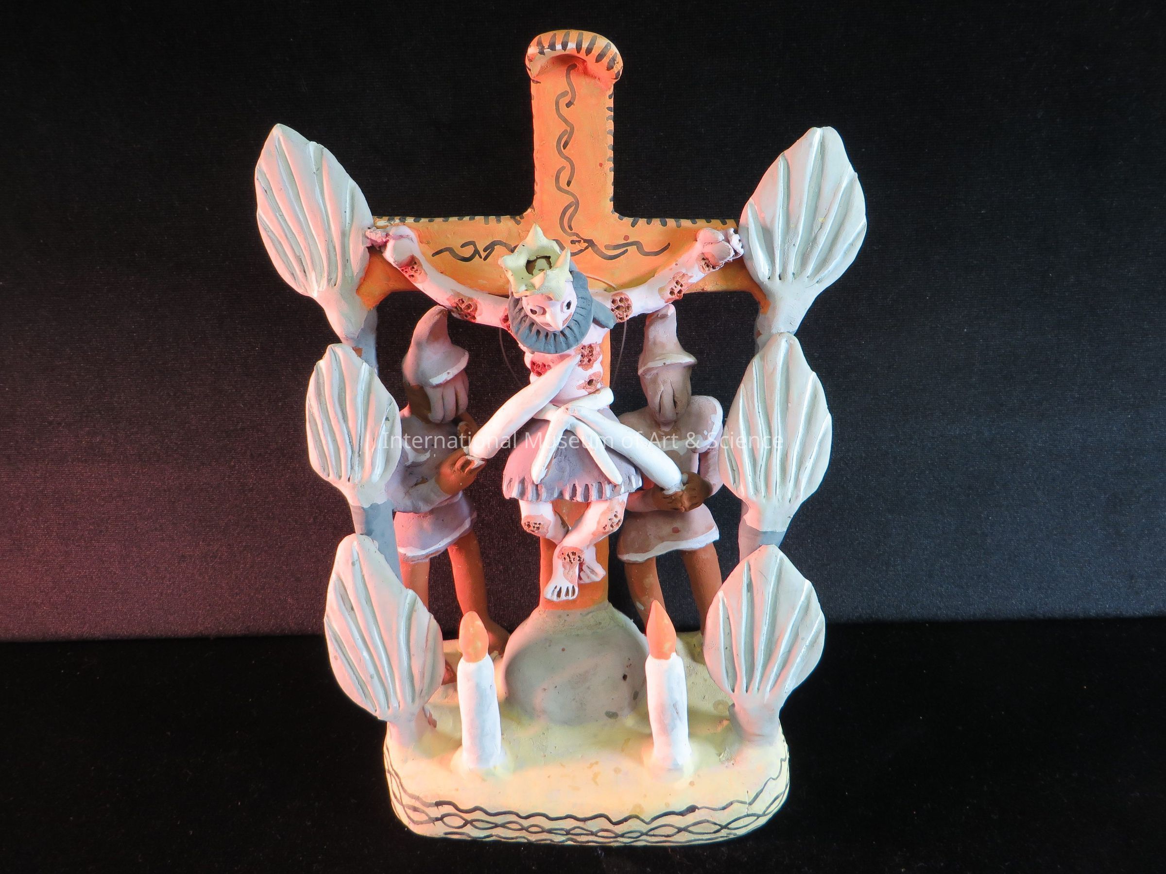 Crucifix. Scene of Jesus being crucified. He is on a crass, with two soldiers impaling his torso. There are palm branches on both sides with two torches on the ground in front of him.Made/Created