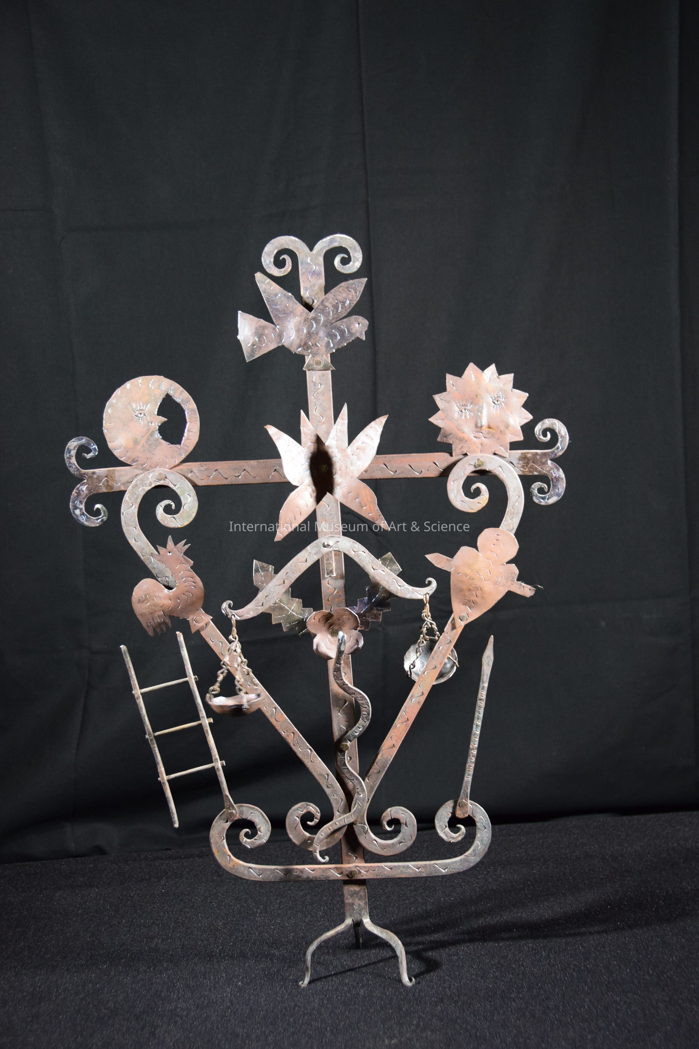 An iron cross. The cross stands on a 3-legged base. it is decorated with religious symbols, including a serpent, a ladder, a spear, a heart, a rooster, a dove, the sun and the moon. The metal has a patina.Made/Created