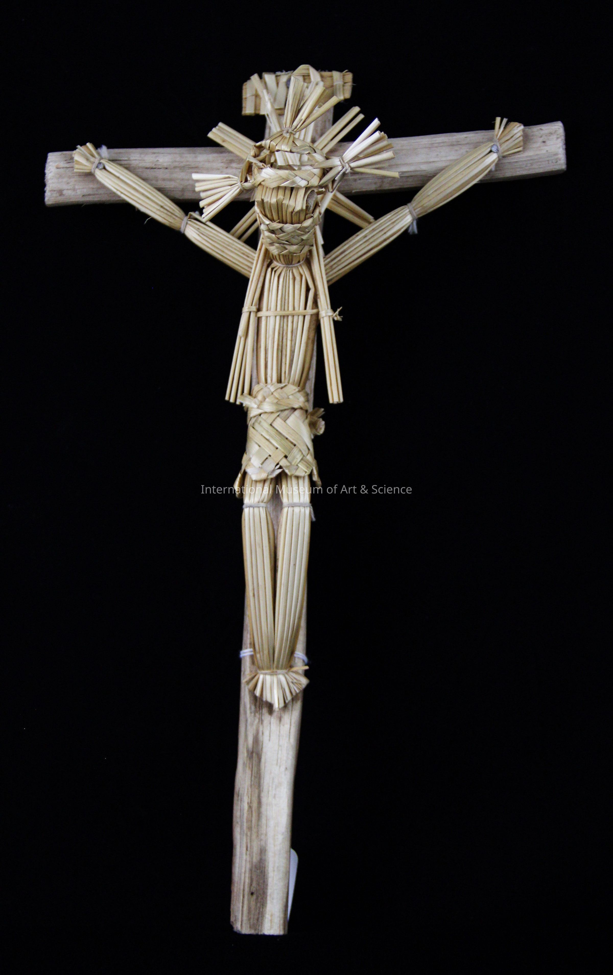 Cross. Christ figure on wooden cross; Christ figure made of natural wheat straw; strips gathered, folded, tied and woven to form the figure, hung and nailed; sign with "INRI" letters also made of wheat straw strips and is nailed to wooden cross; short piece of wood nailed horizontally with long vertical piece of wood for cross; woven star nailed onto horizontal piece.Artwork Details