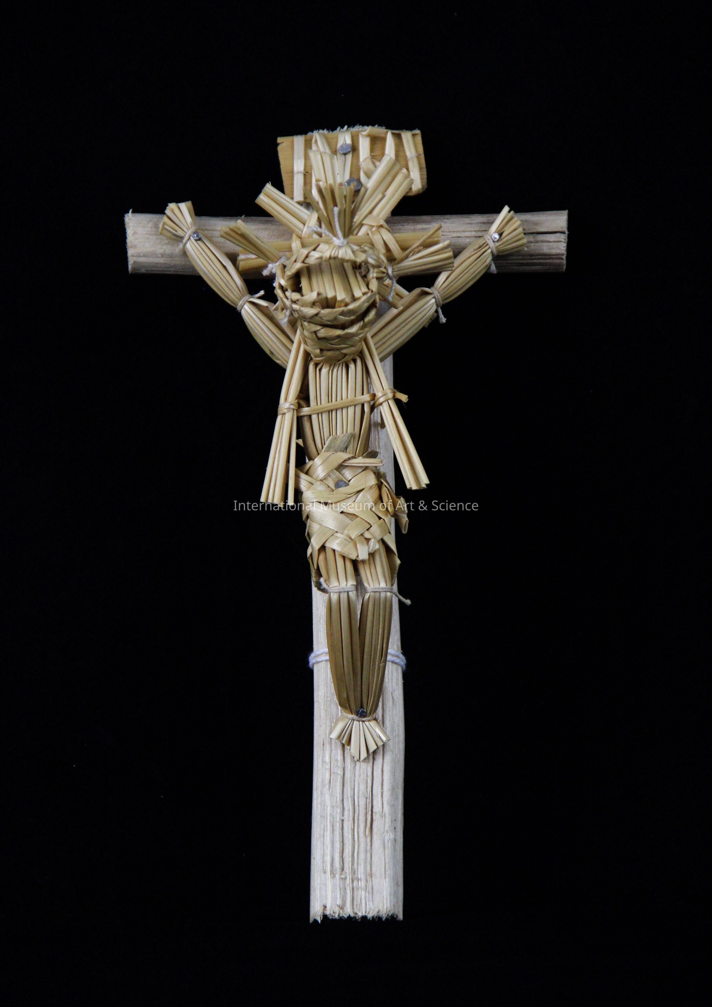 Cross. Christ figure on wooden cross; Christ figure made of natural wheat straw; strips gathered, folded, tied and woven to form the figure, hung and nailed; sign with "INRI" letters also made of wheat straw strips and is nailed to wooden cross; short piece of wood nailed horizontally with long vertical piece of wood for cross; woven star nailed onto horizontal piece.Artwork Details