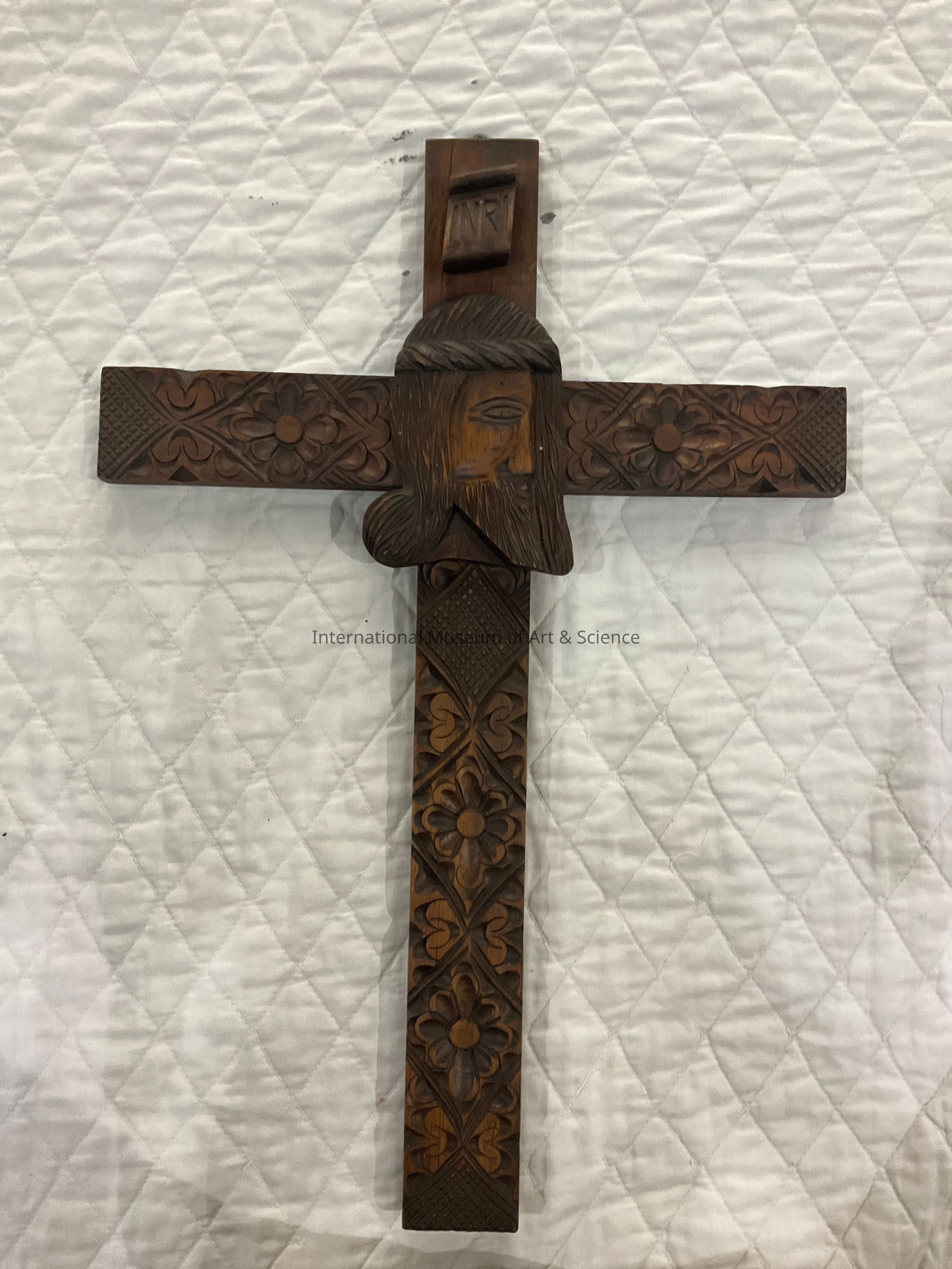 A large wooden cross. The face of Christ is carved into the cross and is surrounded by diamond and floral motifs. "INRI" is carved on the top edge.Dimensions