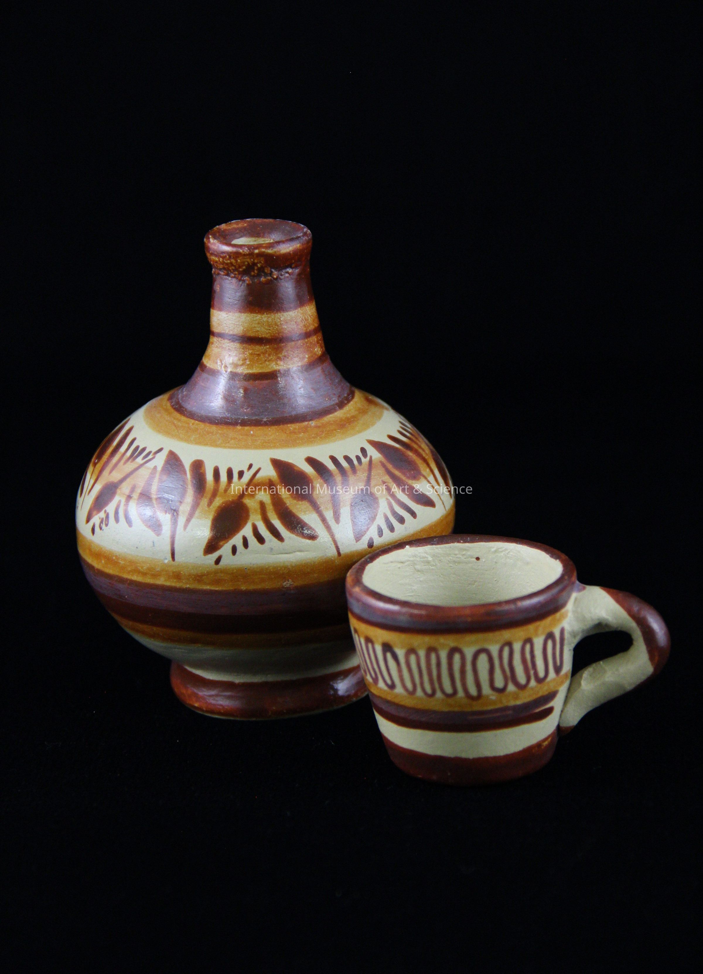 A miniature jug with a matching cup. The cup is decorated with leaf designs and bands executed in light and dark brown hues. The cup can be placed over the neck of the jug for storage.Dimensions