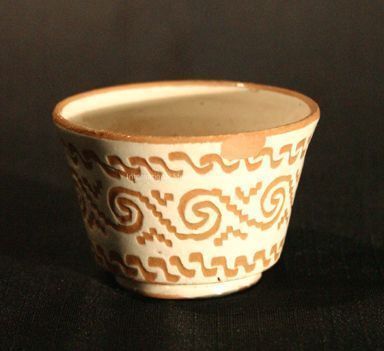 Cup; no handle; chipped on rim; cream glaze with incised abstract design revealing red underneath