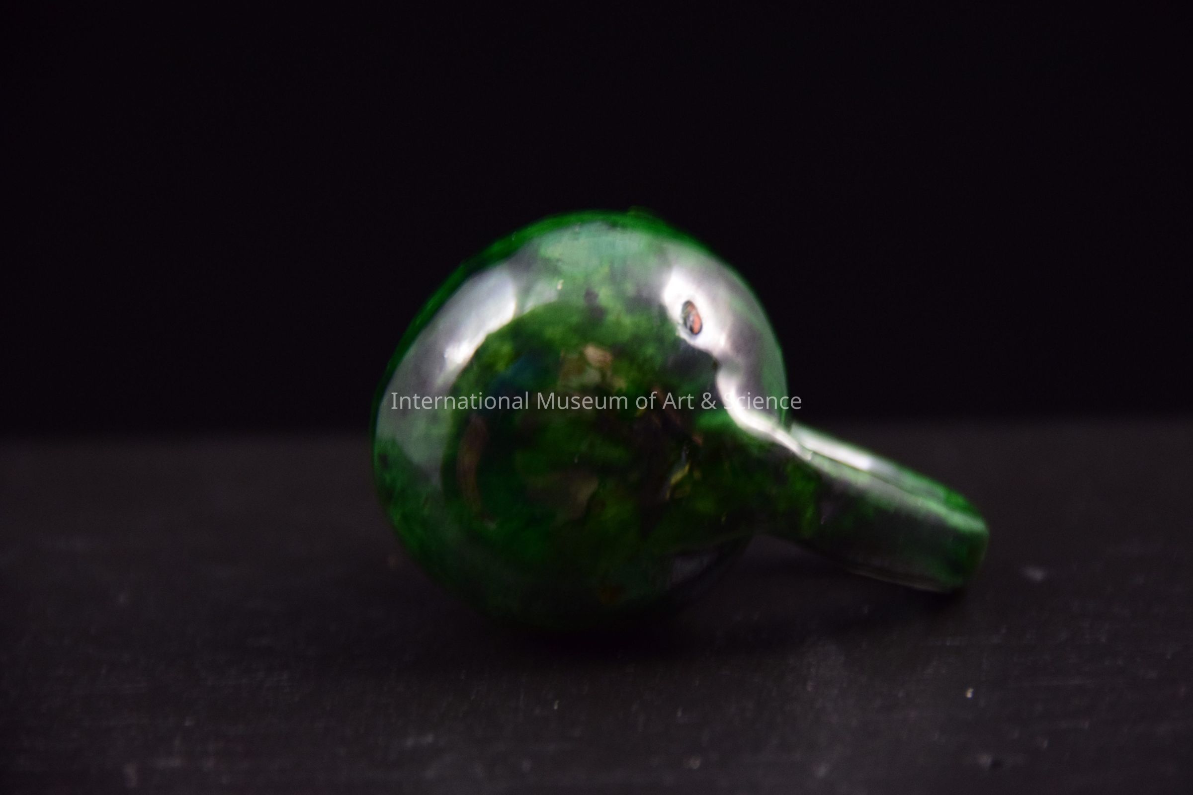 A ceramic miniature punch cup. The cup is glazed in a dark green. The cup has a looped handle on one side. It is part of a set.Dimensions