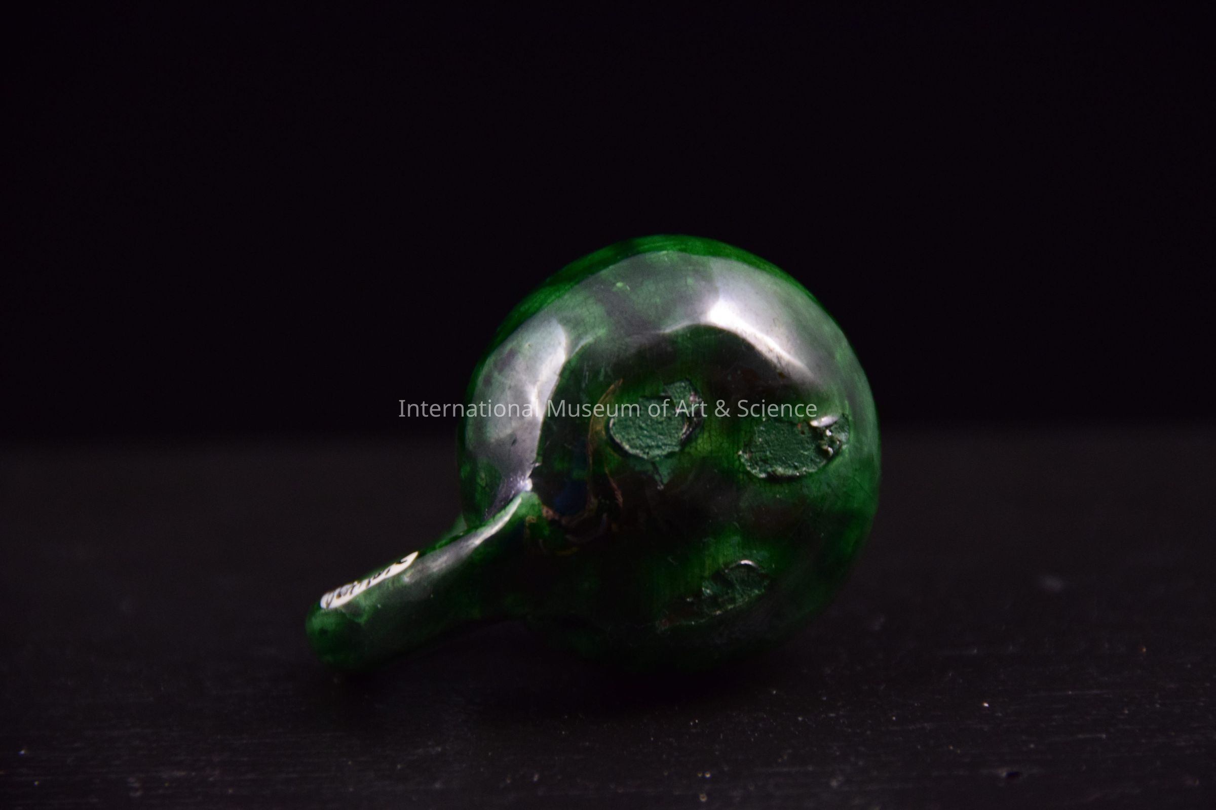 A ceramic miniature punch cup. The cup is glazed in a dark green. The cup has a looped handle on one side. It is part of a set.