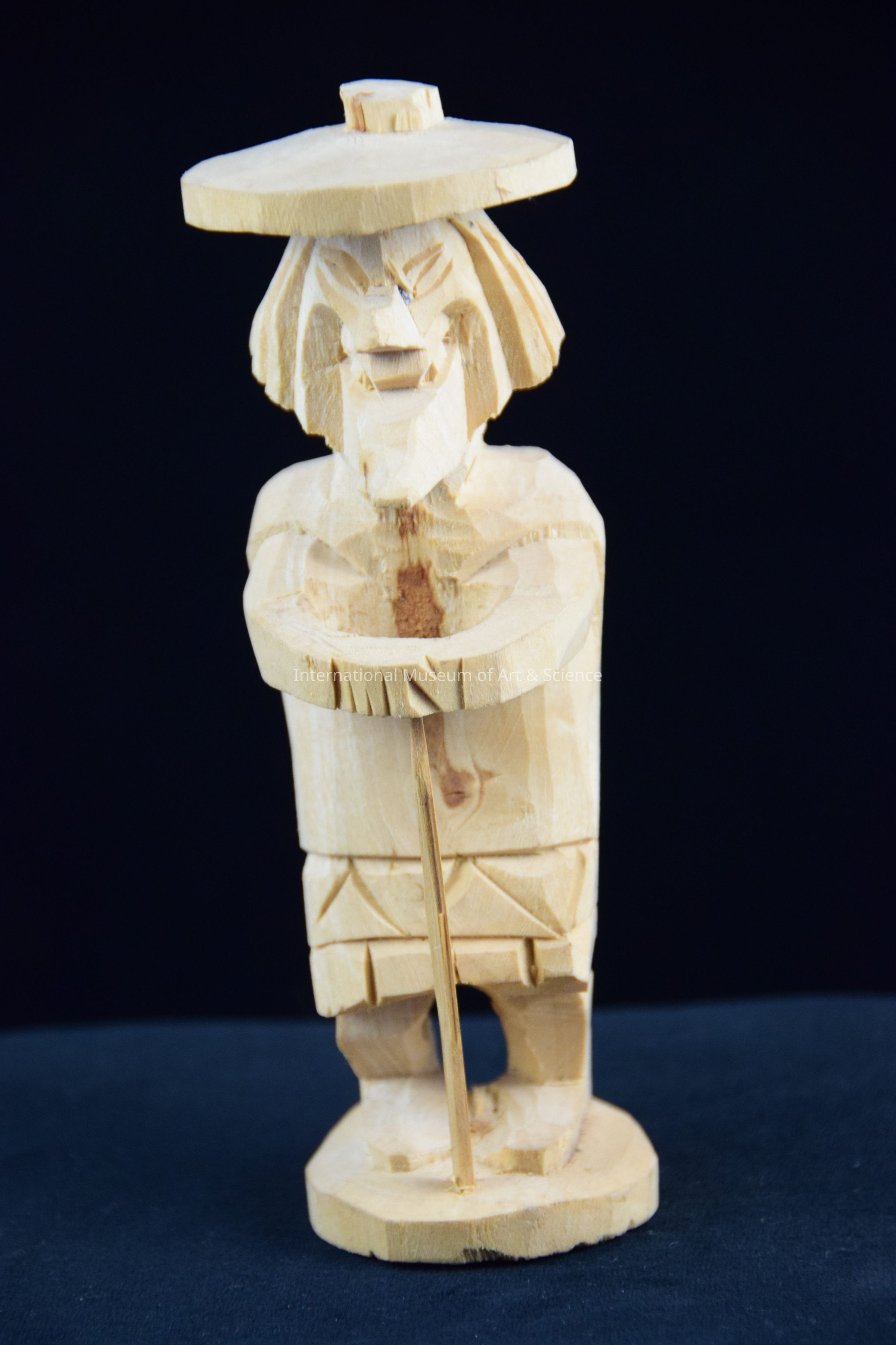 A hand carved wooden figurine. The figure is a man wearing a lagre hat, a poncho, and carrying a cane. He is a figurine depicting the "Dance of the Old Men" (Viejitos). It is part of a group of 5 figurines. The firgines were hand carved in Patzcuaro.Dimensions