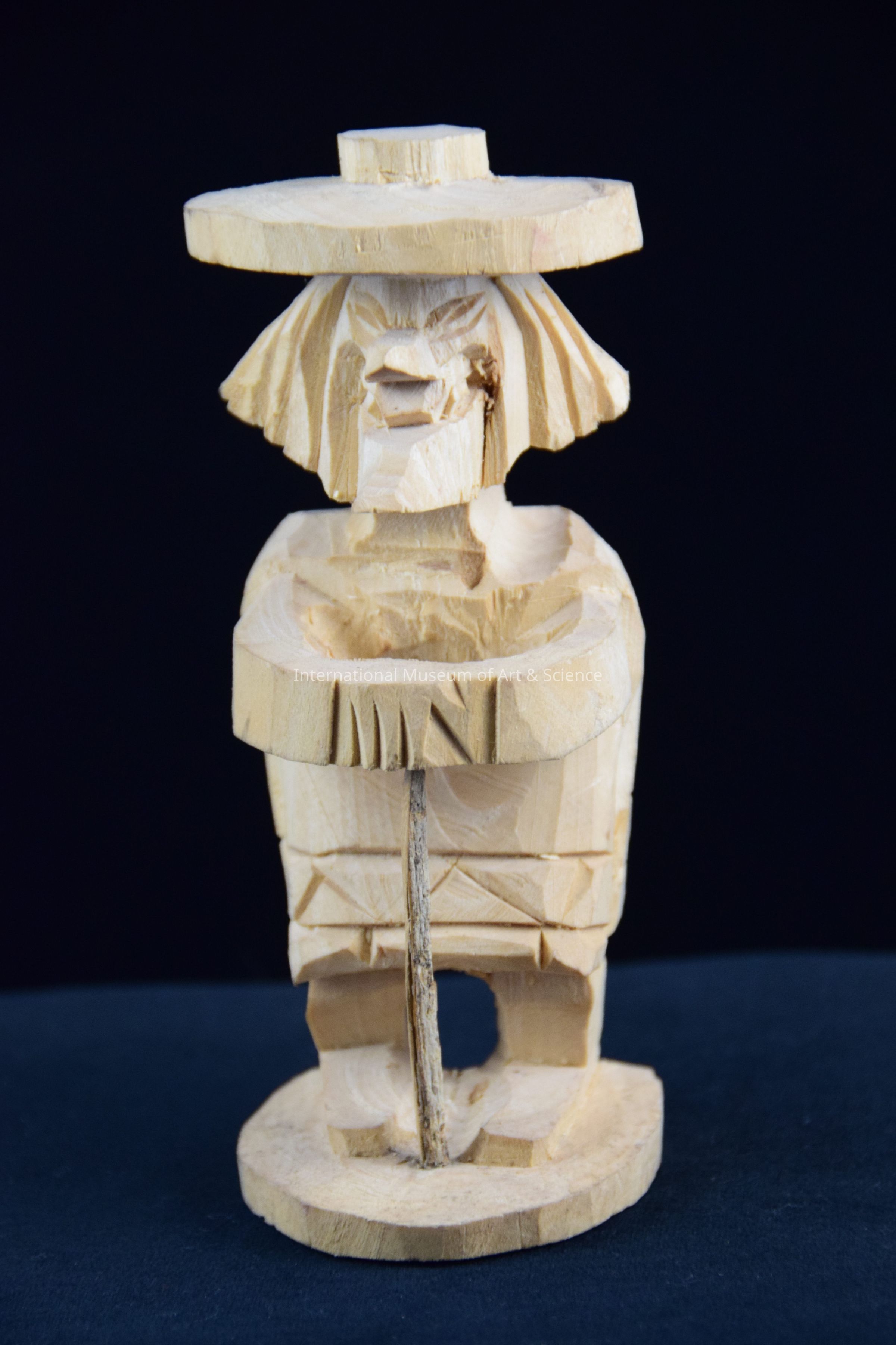 A hand carved wooden figurine. The figure is a man wearing a lagre hat, a poncho, and carrying a cane. He is a figurine depicting the "Dance of the Old Men" (Viejitos). It is part of a group of 5 figurines. The firgines were hand carved in Patzcuaro.Dimensions
