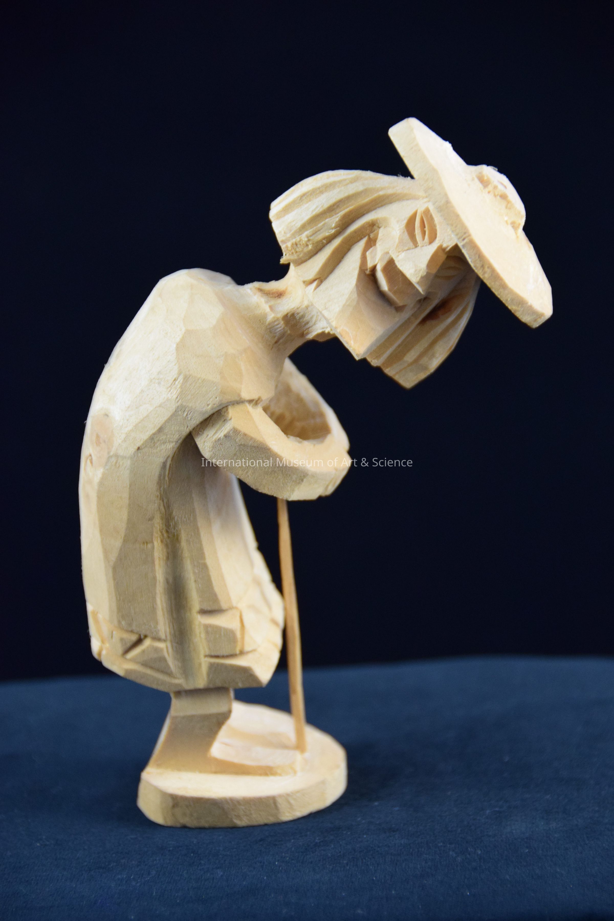 A hand carved wooden figurine. The figure is a man wearing a lagre hat, a poncho, and carrying a cane. The figurine is bent over and looking behind himself. He is a figurine depicting the "Dance of the Old Men" (Viejitos). It is part of a group of 5 figurines. The firgines were hand carved in Patzcuaro. The one looking back is usually placed at the front of the line.