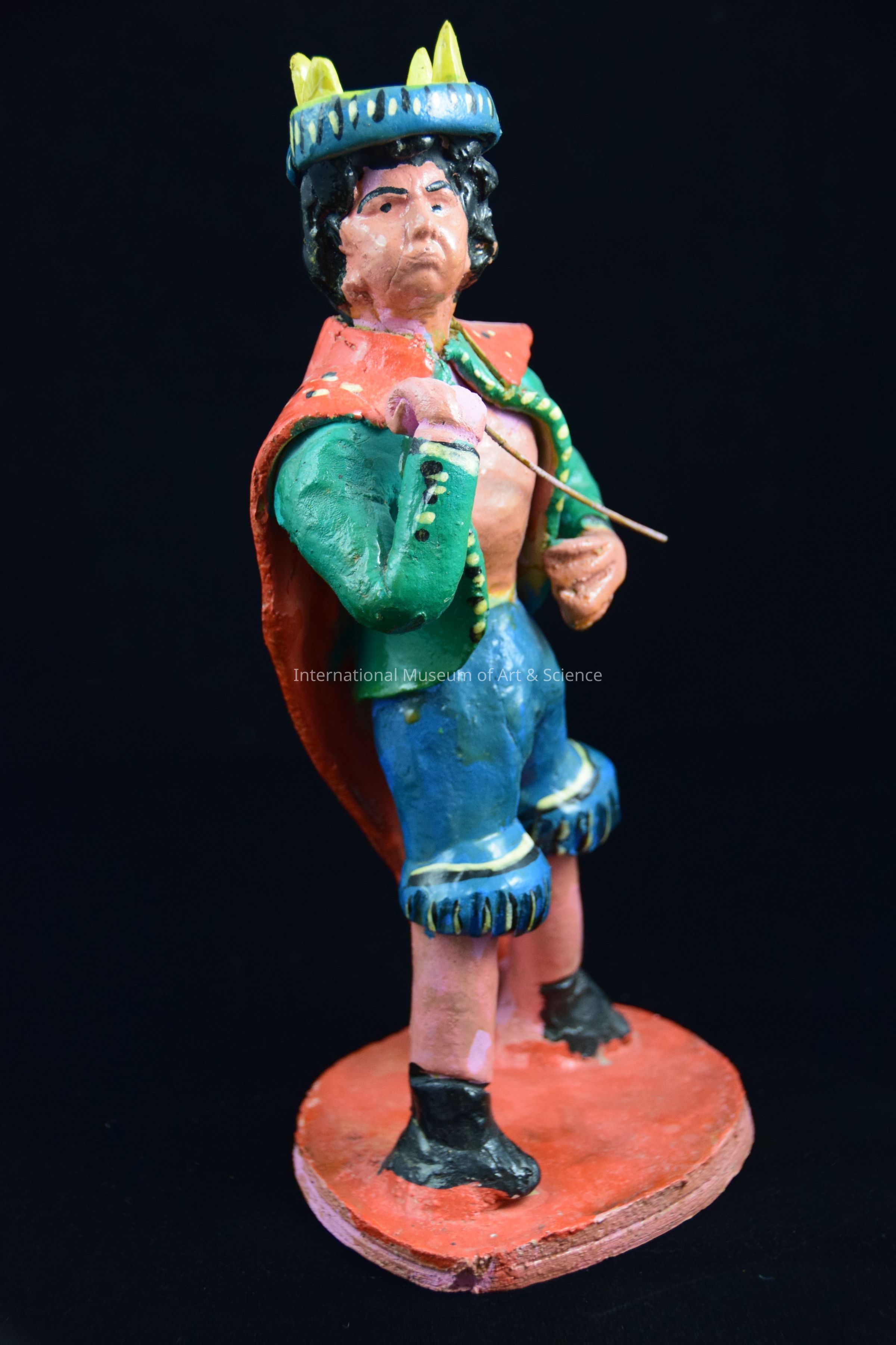 A ceramic figurine of a man. He is wearing an lilac shirt, blue short pants, an orange spotted cape, a green jacket, and a yellow crown. He has a wire staff in his right hand. The figure stands on an orange and lilac base. He is part of a group of figurines.Artwork Details