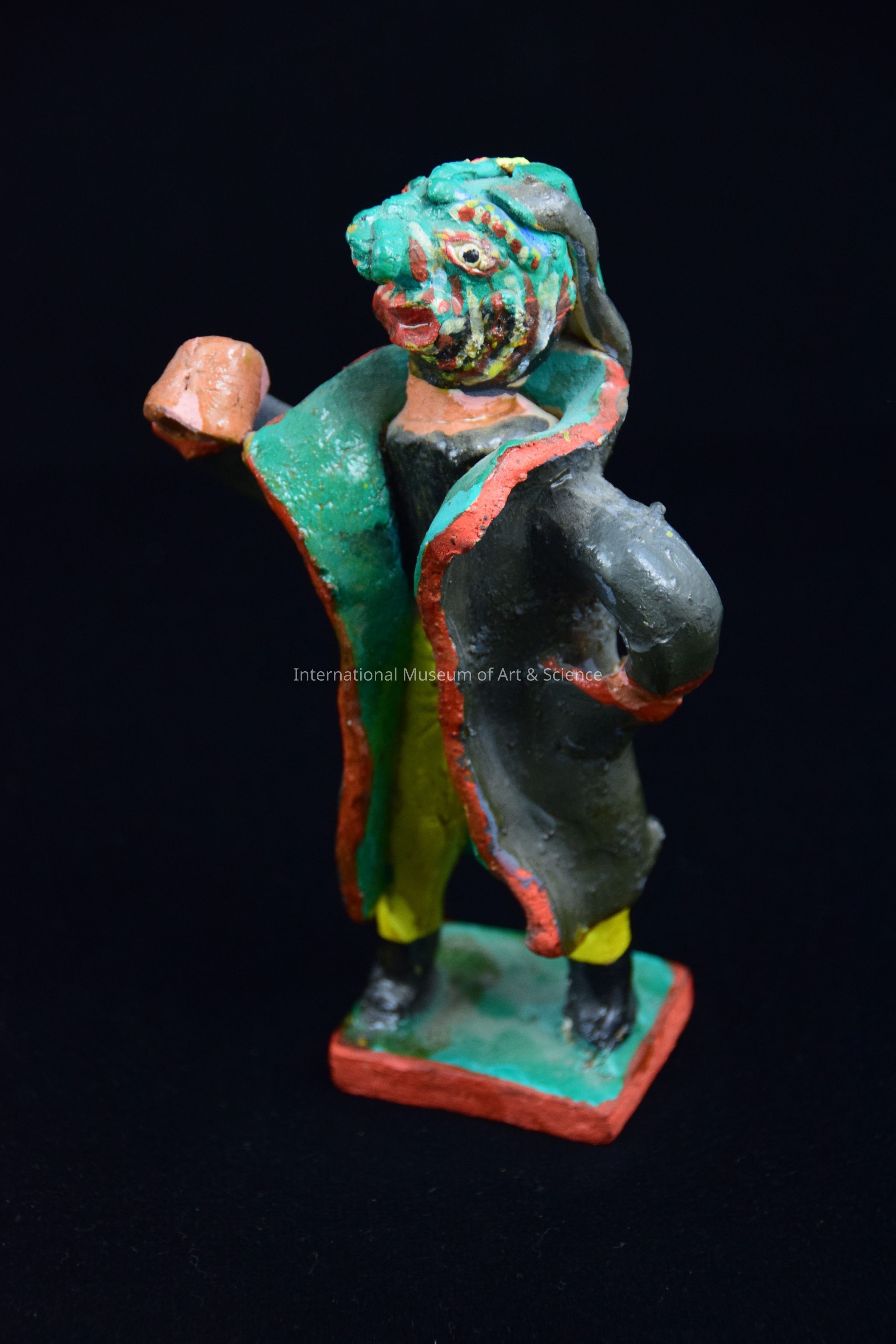 A clay figurine of a man standing with a mask on his face. He is wearing a large coat, a black shirt, yellow pants, and black shoes. He is holding something in his right hand. His mask is very colorful and has a wig down the back of the head. The figure stands on a green and orange base.