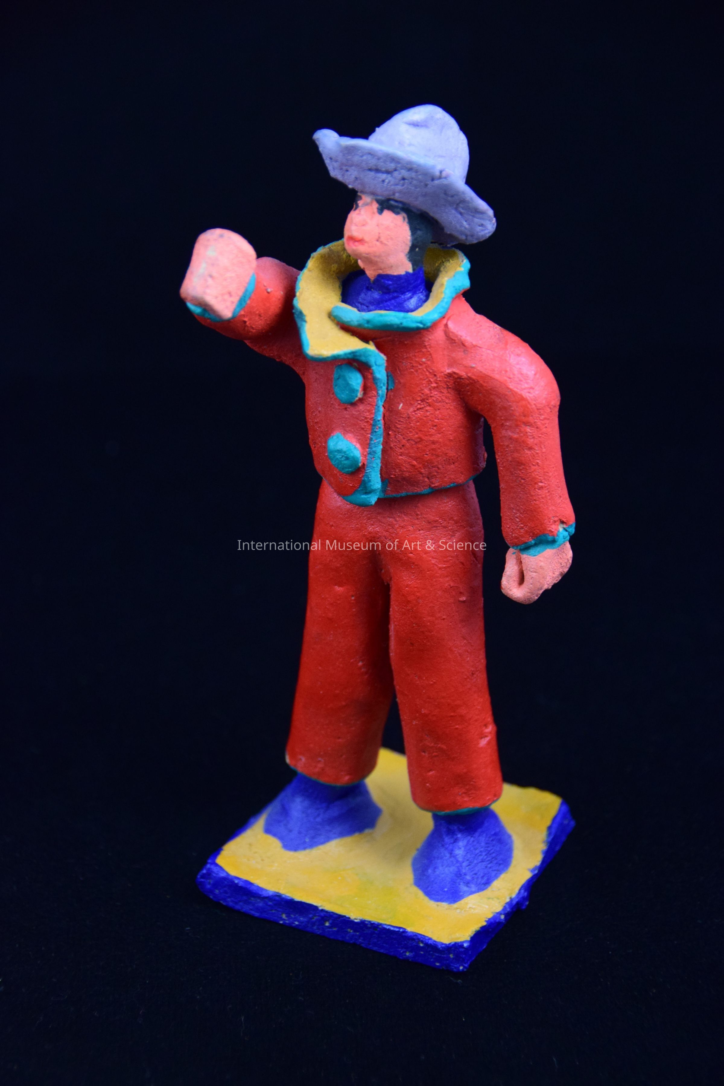 A clay figurine of a man standing with a purple hat on his head. He is wearing a red coat withy green trim and buttoms, red pants, and blue shoes. He is holding his arm out. The figure stands on a orange and blue base.