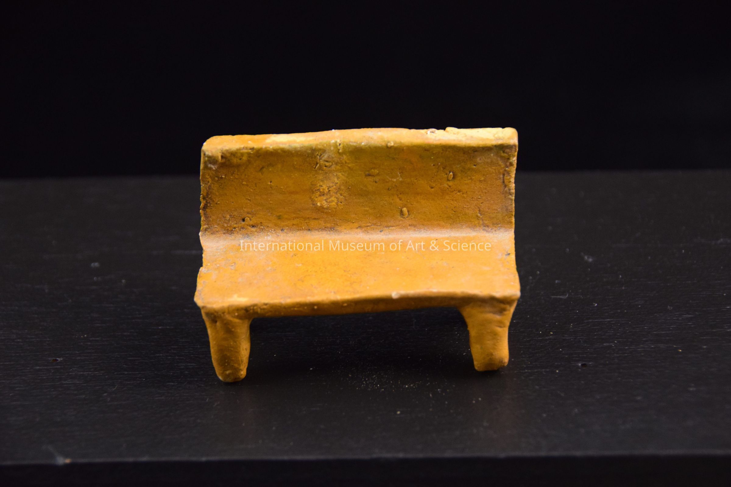 A clay figurine of a blue bench with four legs and a back.