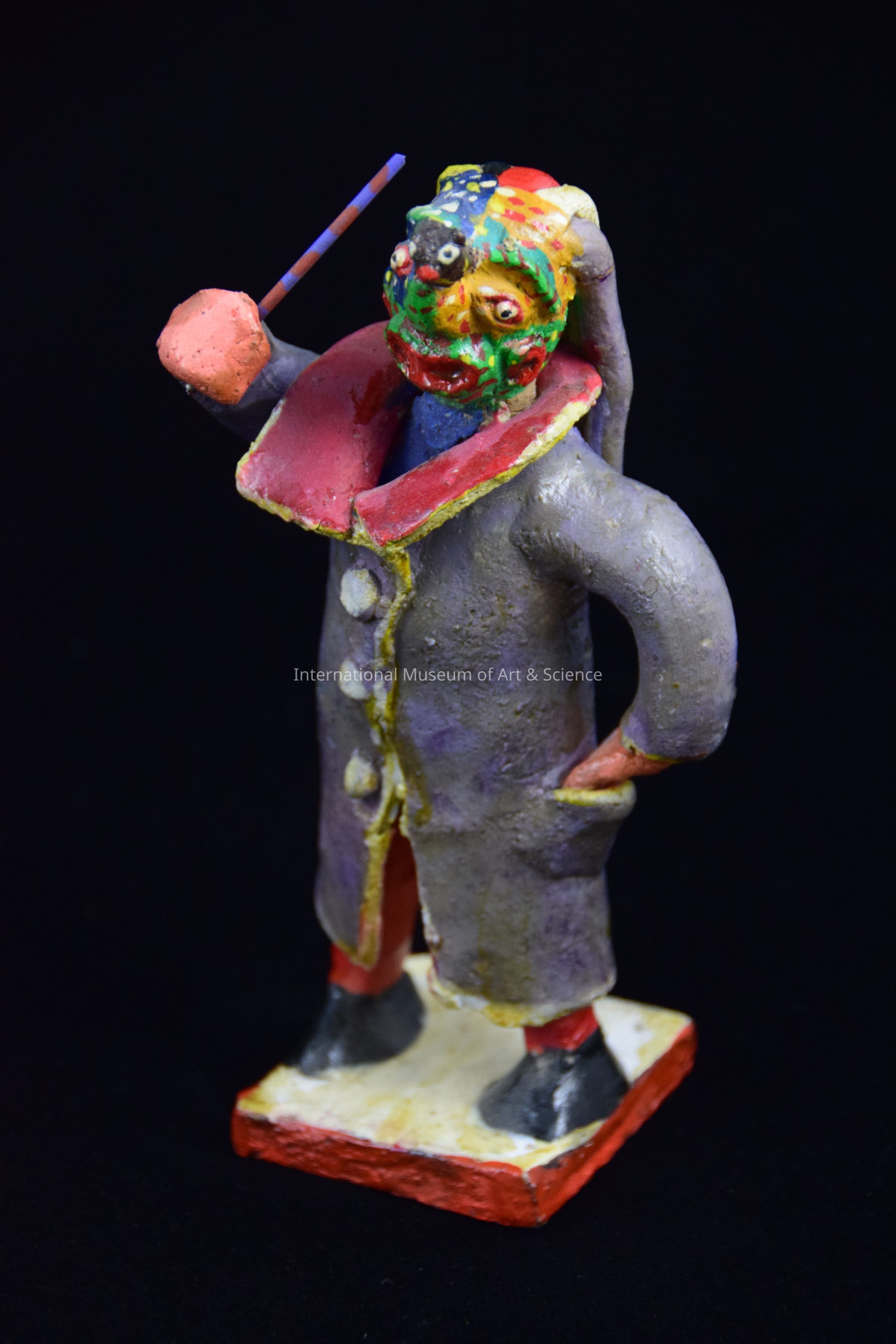 A clay figurine of a man standing with a mask on his face. He is wearing a large purple coat, red pants, and black shoes. He is holding a staff/wand in his right hand. His mask is very colorful and has a wig down the back of the head. The figure stands on a white and red base.