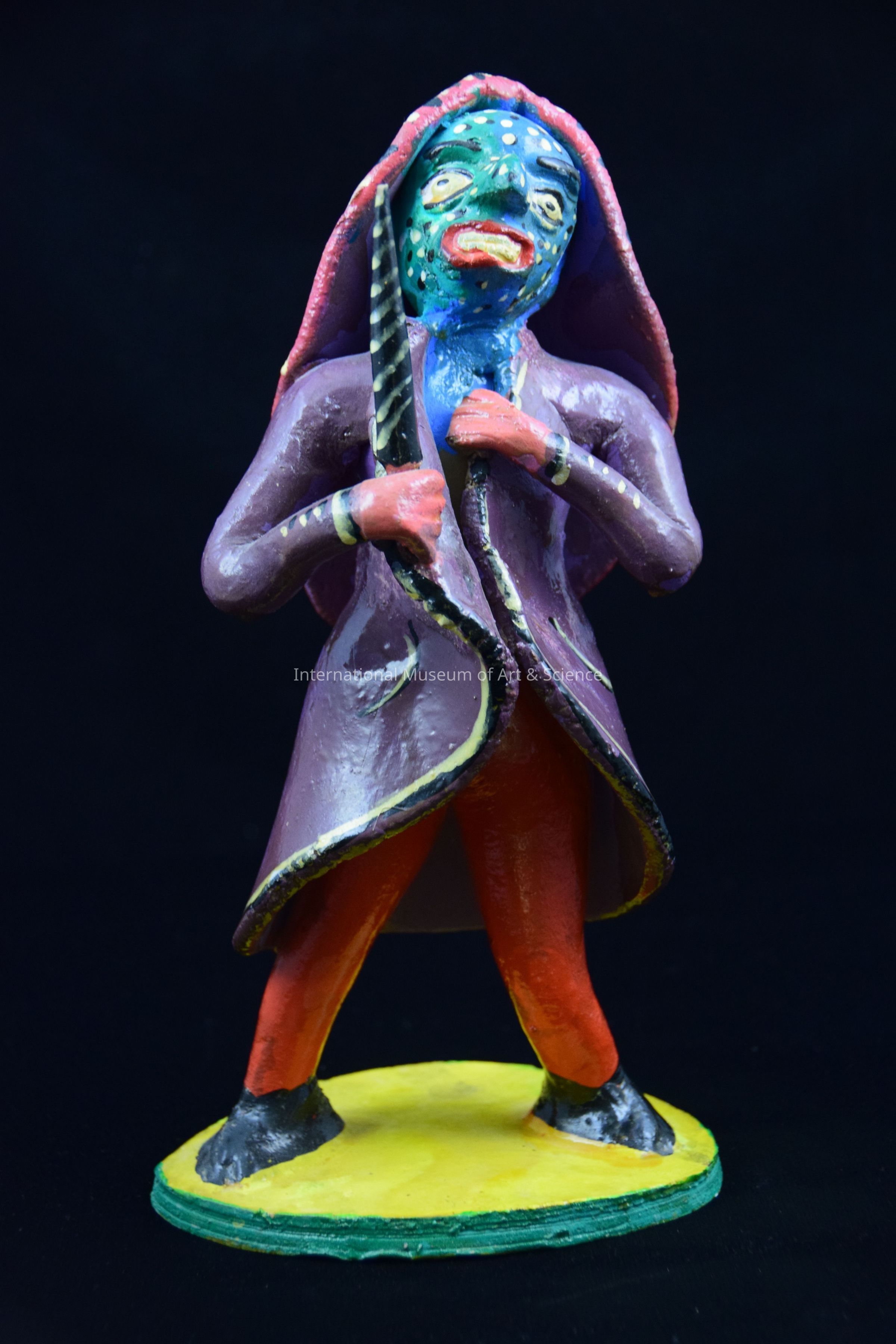 A ceramic figurine of a man. He is wearing a blue shirt, orange pants, a purple jacket, a multicolored mask, and a pink wig. He has a black sword in his right hand. The figure stands on a green and yellow base. He is part of a group of figurines.Artwork Details