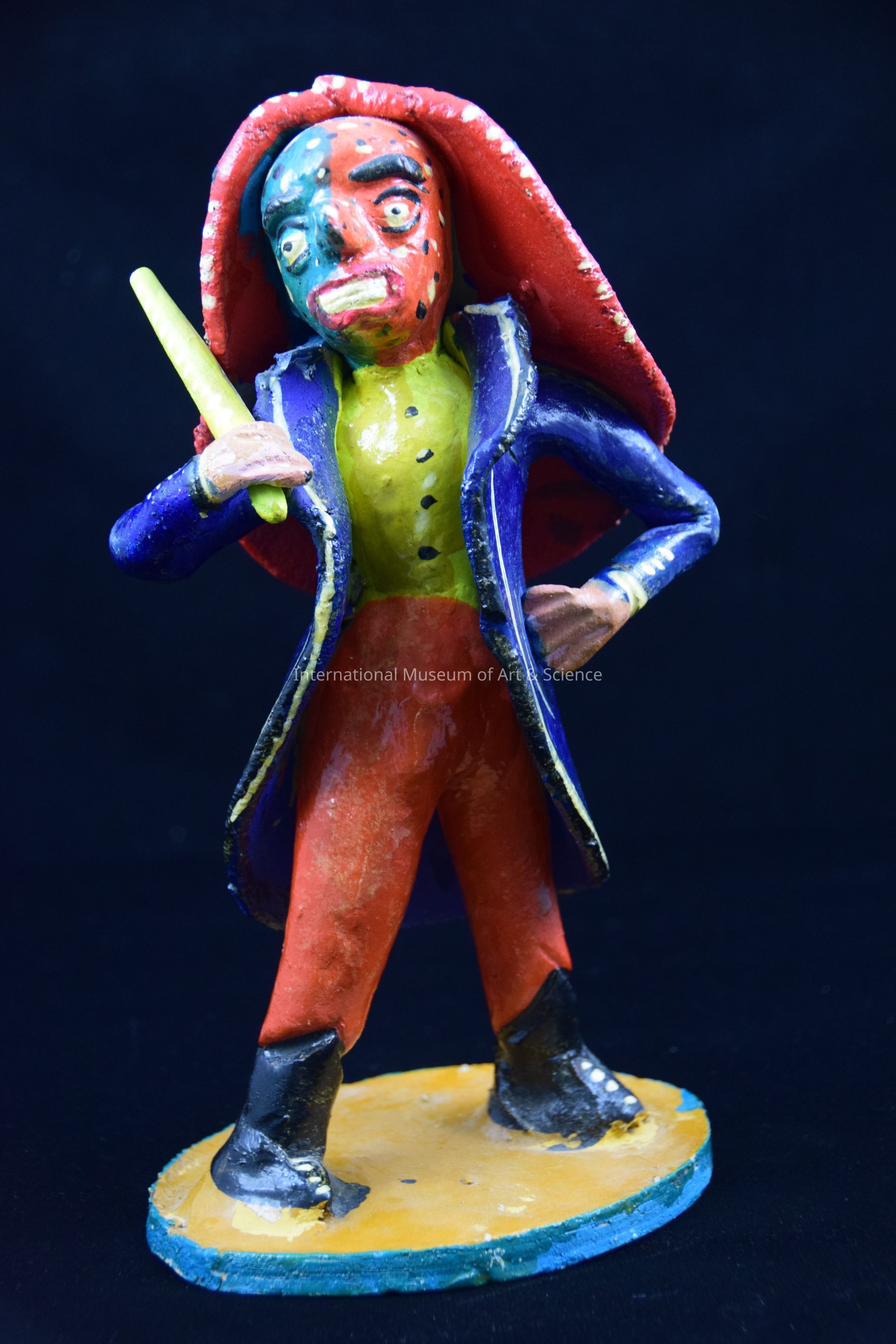 A ceramic figurine of a man. He is wearing a yellow shirt, orange pants, a blue jacket, a multicolored mask, and a red wig. He has a yellow sword in his right hand (the tip has broke off). The figure stands on a mustard and teal base. He is part of a group of figurines.Artwork Details