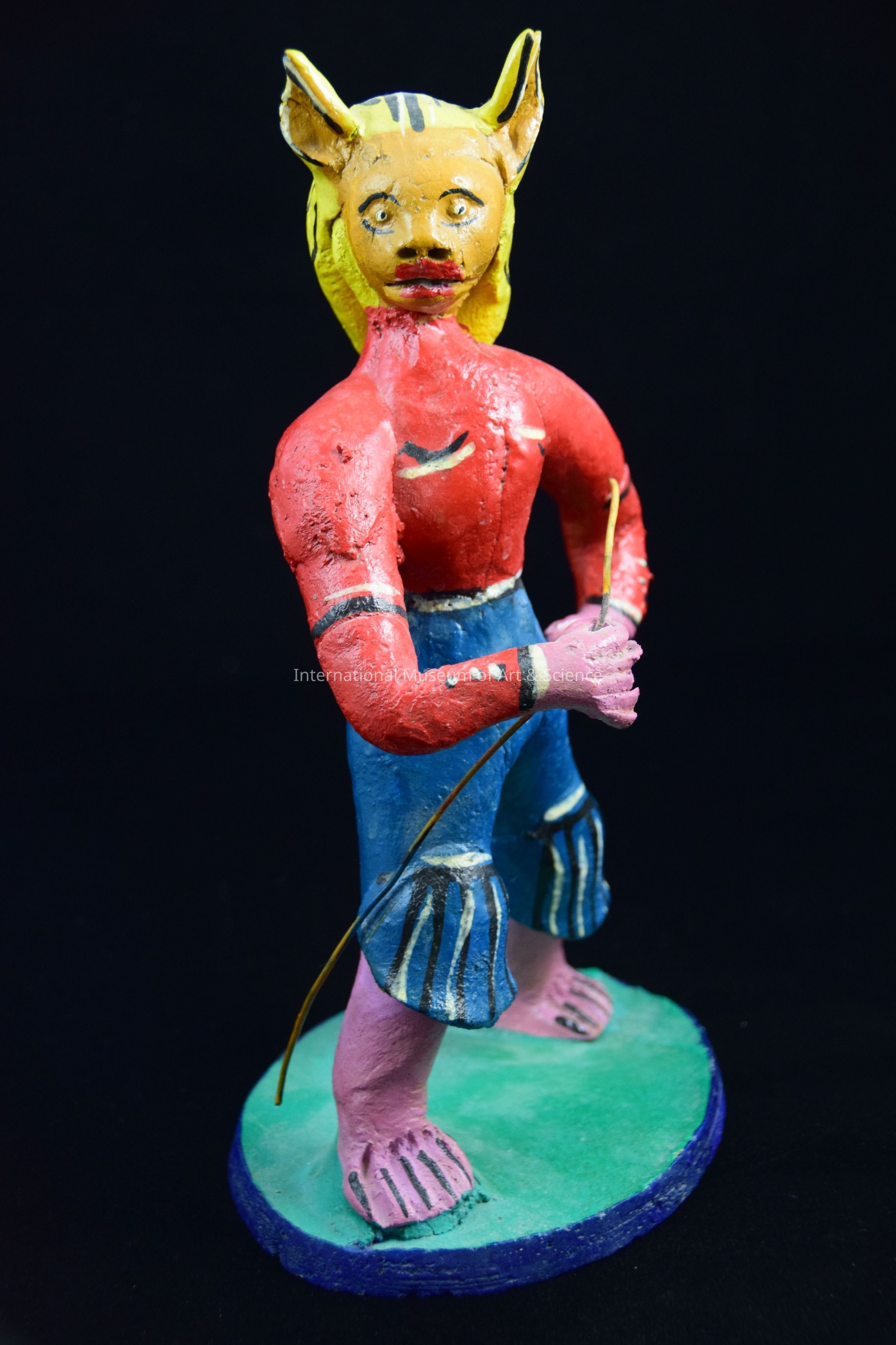A ceramic figurine of a man. He is wearing an red shirt and blue short pants. The figure has a lion mask and a long headdress. He has a wire staff in his right hand. The figure stands on a greeb and navy blue base. He is part of a group of figurines.Artwork Details