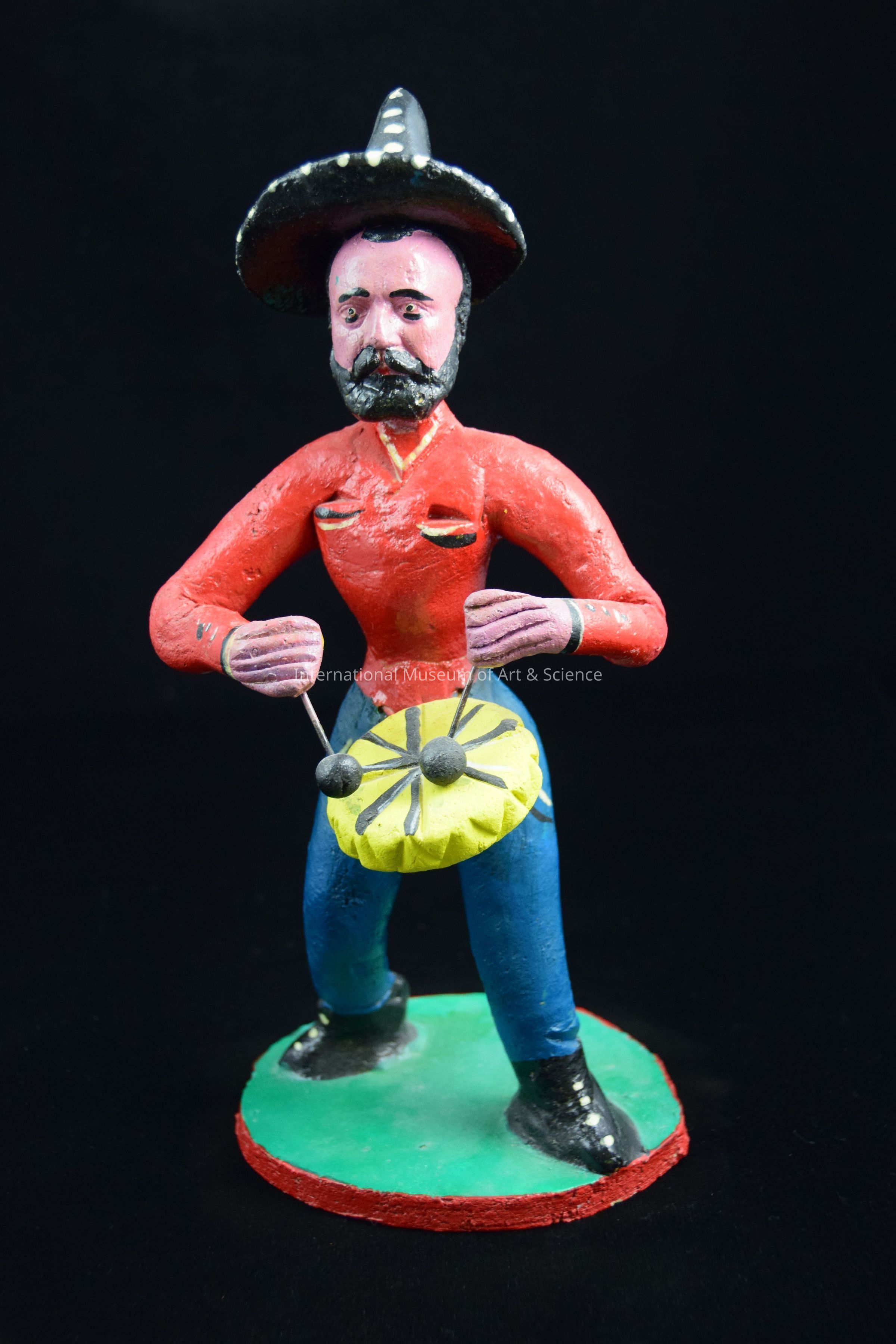 A ceramic figurine of a man. He is wearing an red shirt, blue pants, and a black hat. He has a yellow drum and is holding a drumstick in each hand. The figure stands on a red and green base He is part of a group of figurines.Artwork Details