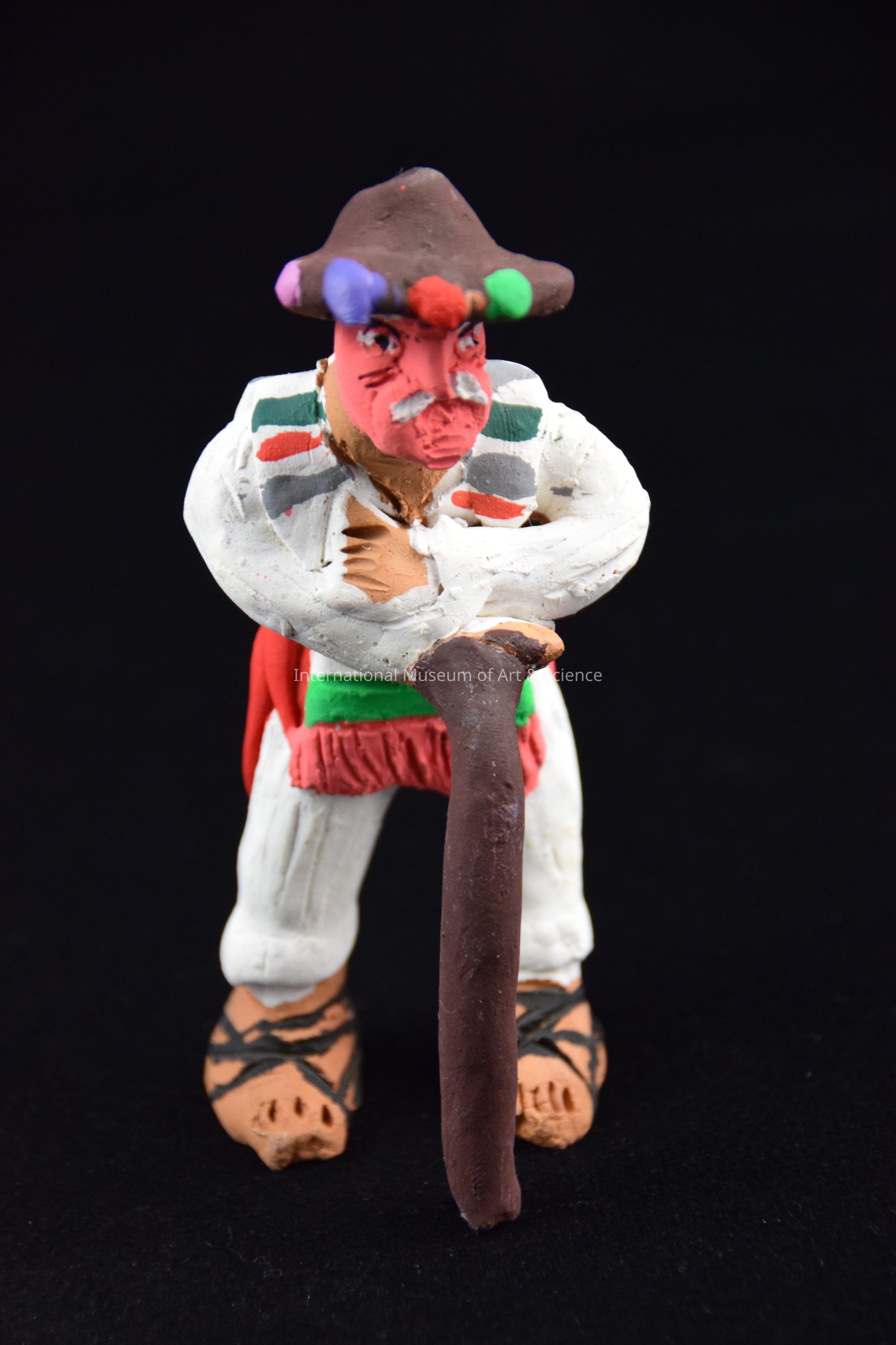 A clay figurine of a "Viejito" or old man. He is wearing a white costume, a pink mask, a poncho, a brown hat, and holding a cane. He is part of a group of figures.