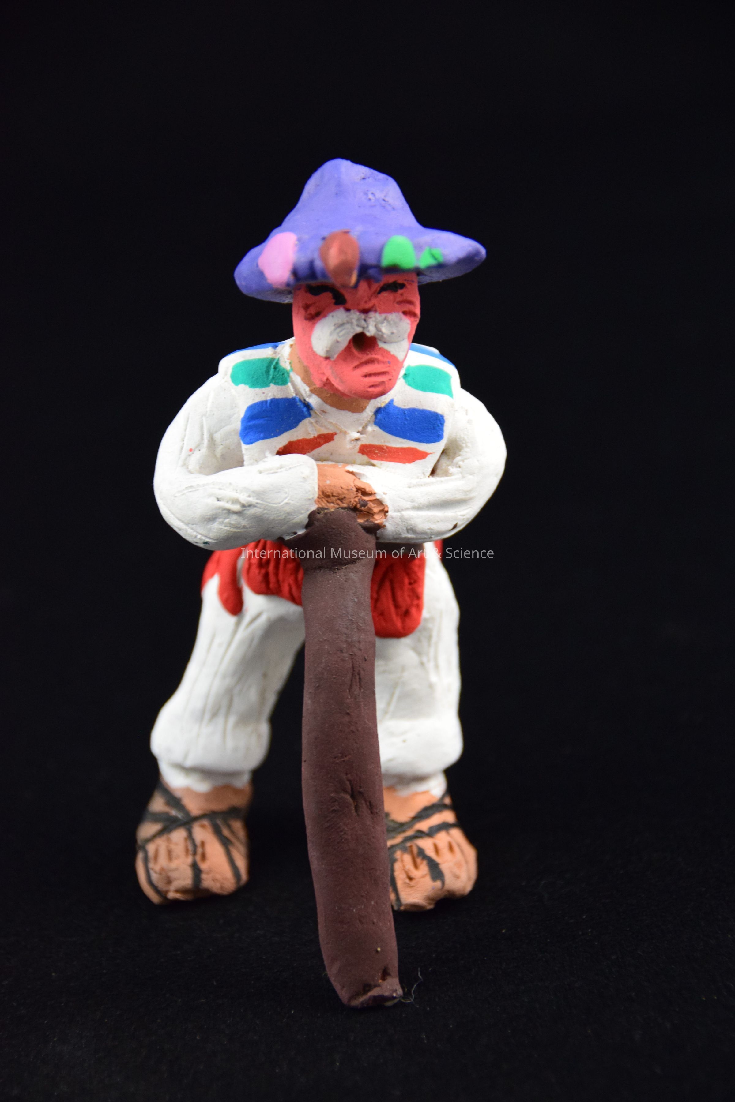 A clay figurine of a "Viejito" or old man. He is wearing a white costume, a pink mask, a poncho, a purple hat, and holding a cane. He is part of a group of figures.