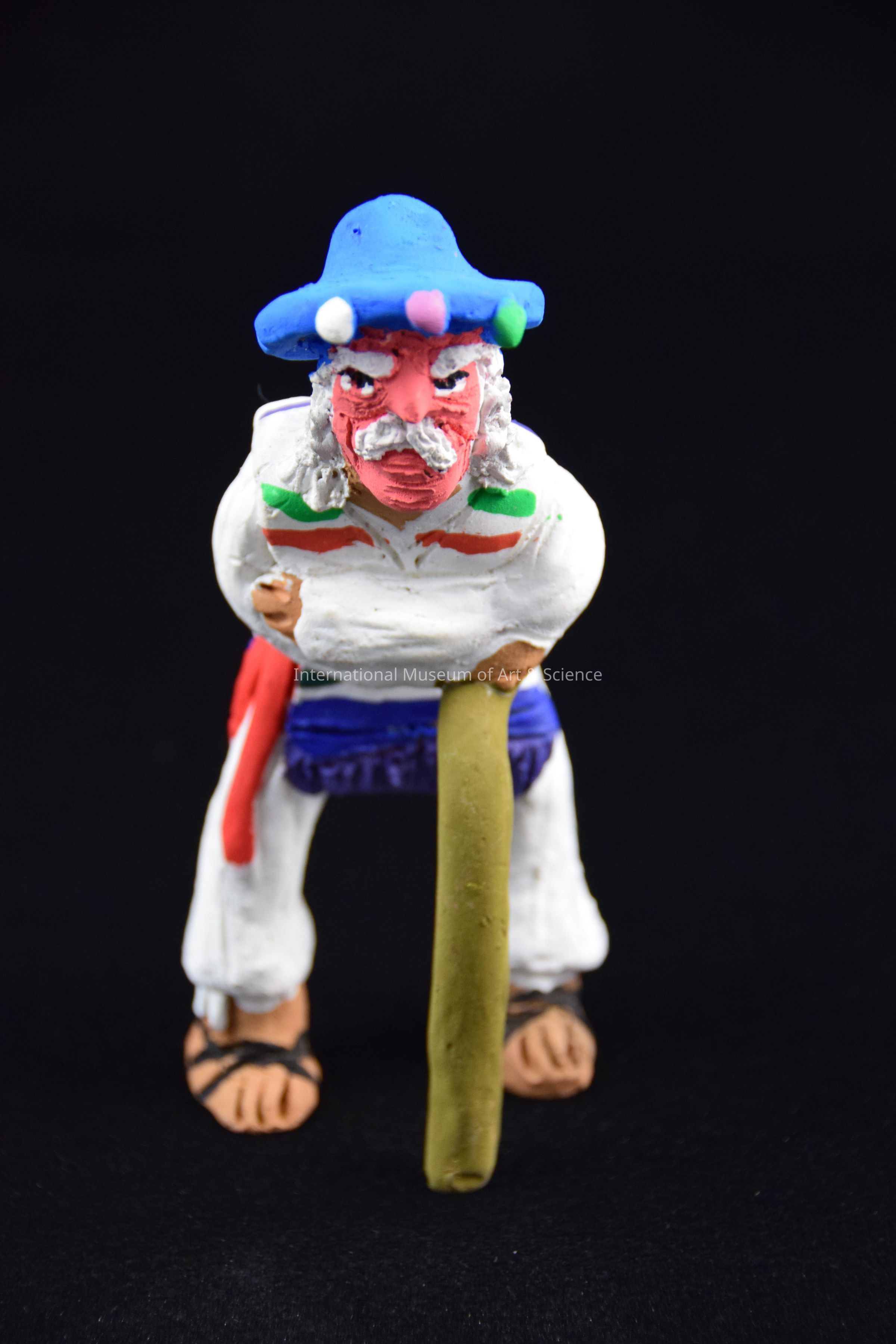 A clay figurine of a "Viejito" or old man. He is wearing a white costume, a pink mask, a poncho, a blue hat, and holding a cane. He is part of a group of figures.