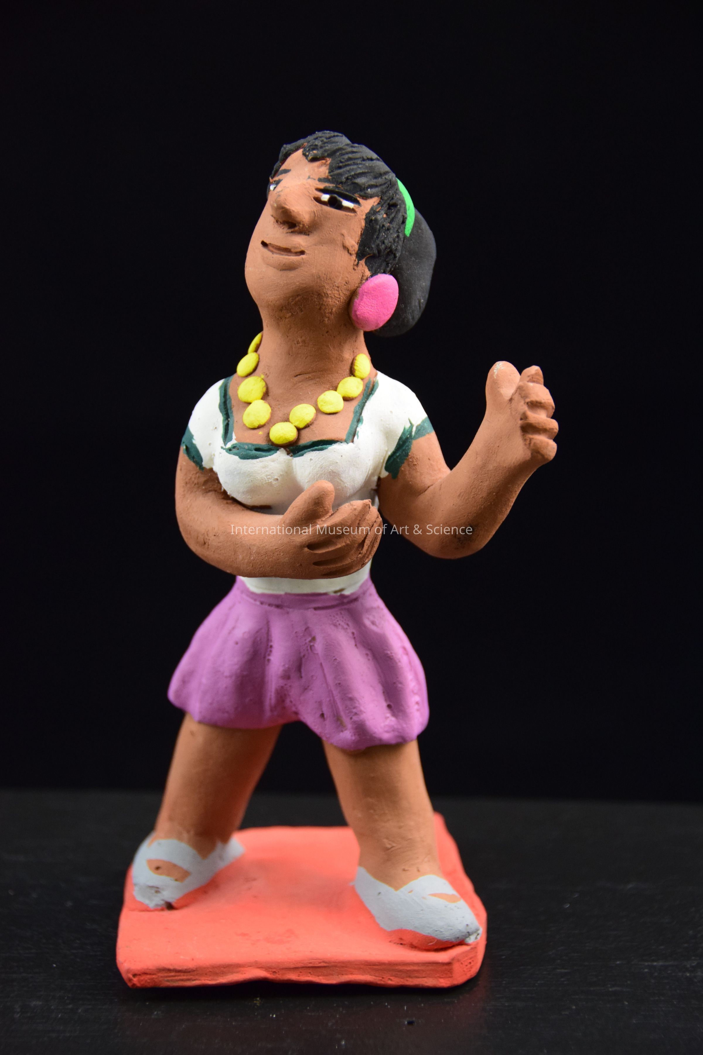 A ceramic figurine of a girl. She is wearing a white top with green trim, a lilac purple skirt, grey shoes, a yellow necklace, and pink earrings. She is part of a group of dancers.Dimensions