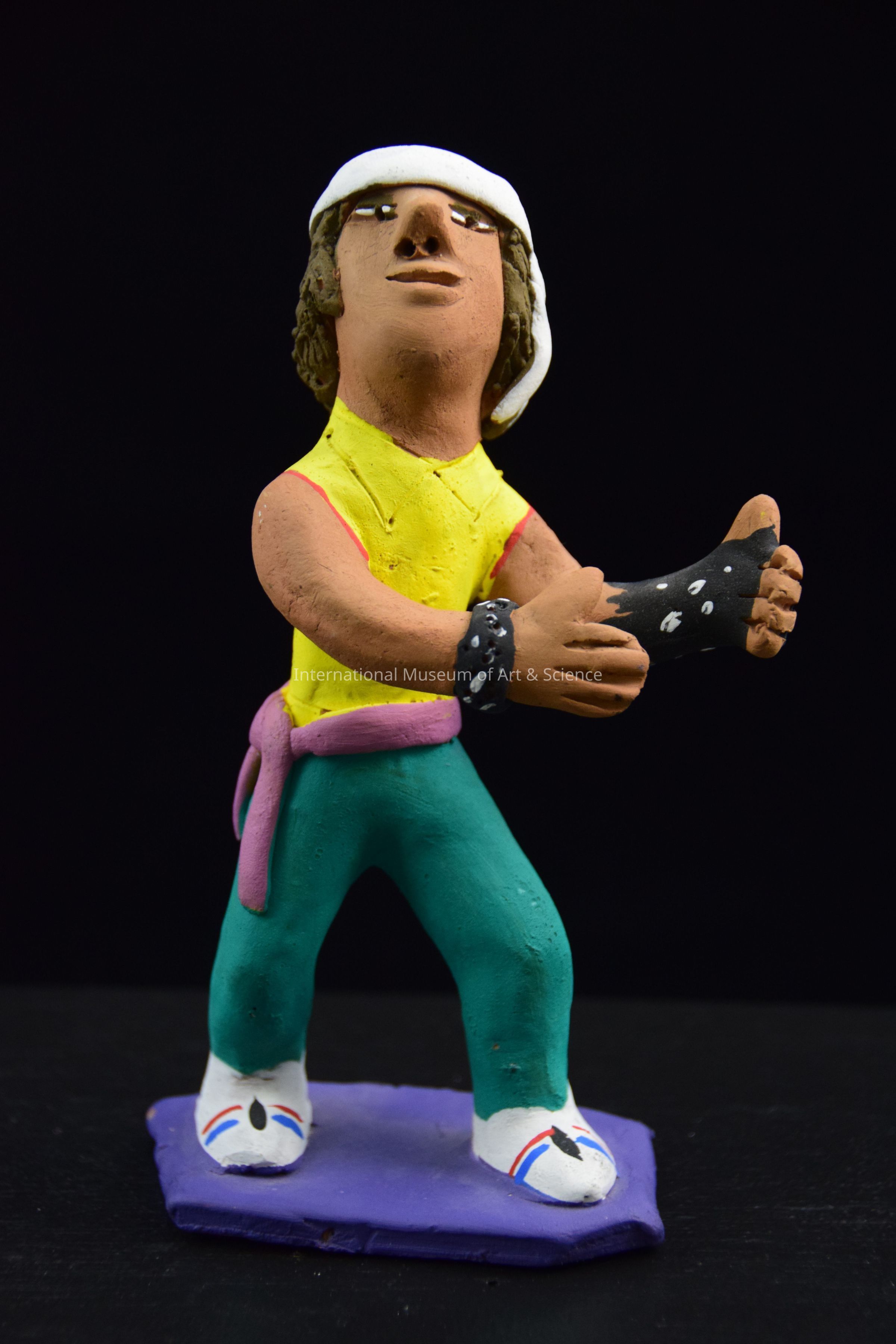 A ceramic figurine of a boy. He is wearing a yellow shirt, green pants, a purple belt, a white headband, a black bracelet and fingerless glove, and white shoes. He is part of a group of dancers.