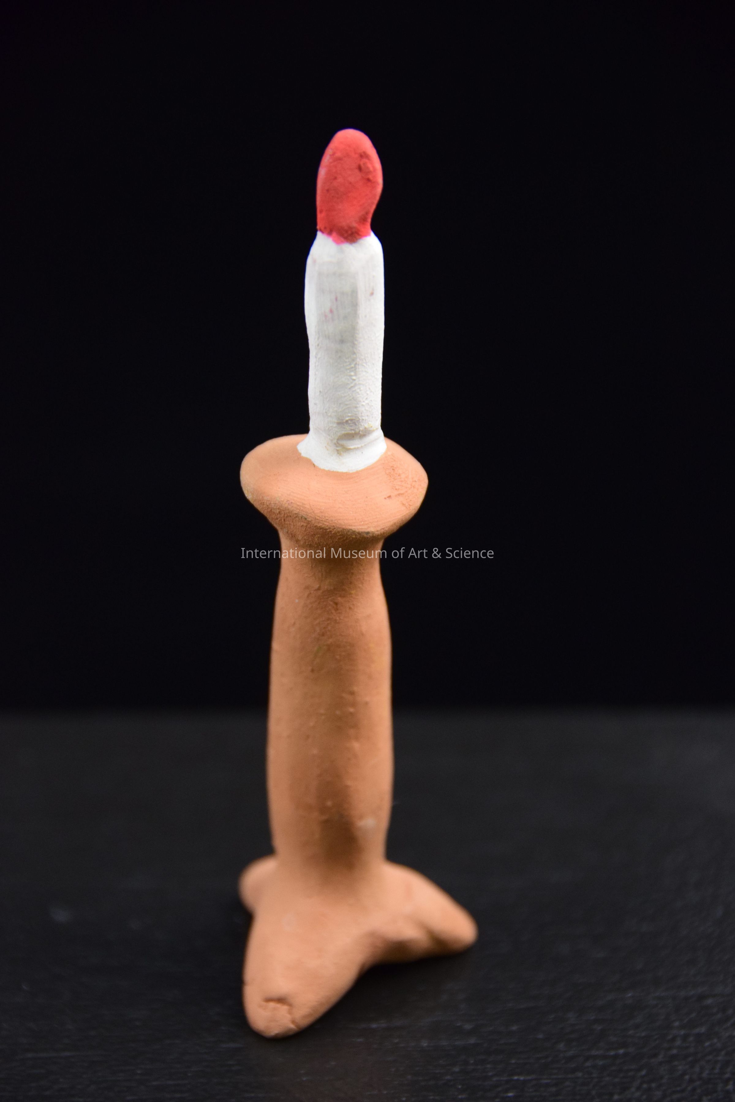 A ceramic figurine of a candle with candlestick. The candlestick is unpainted. The candle is white with a red flame . It is part of a 19 piece set of offerings for a Day of the Dead altar.Made/Created