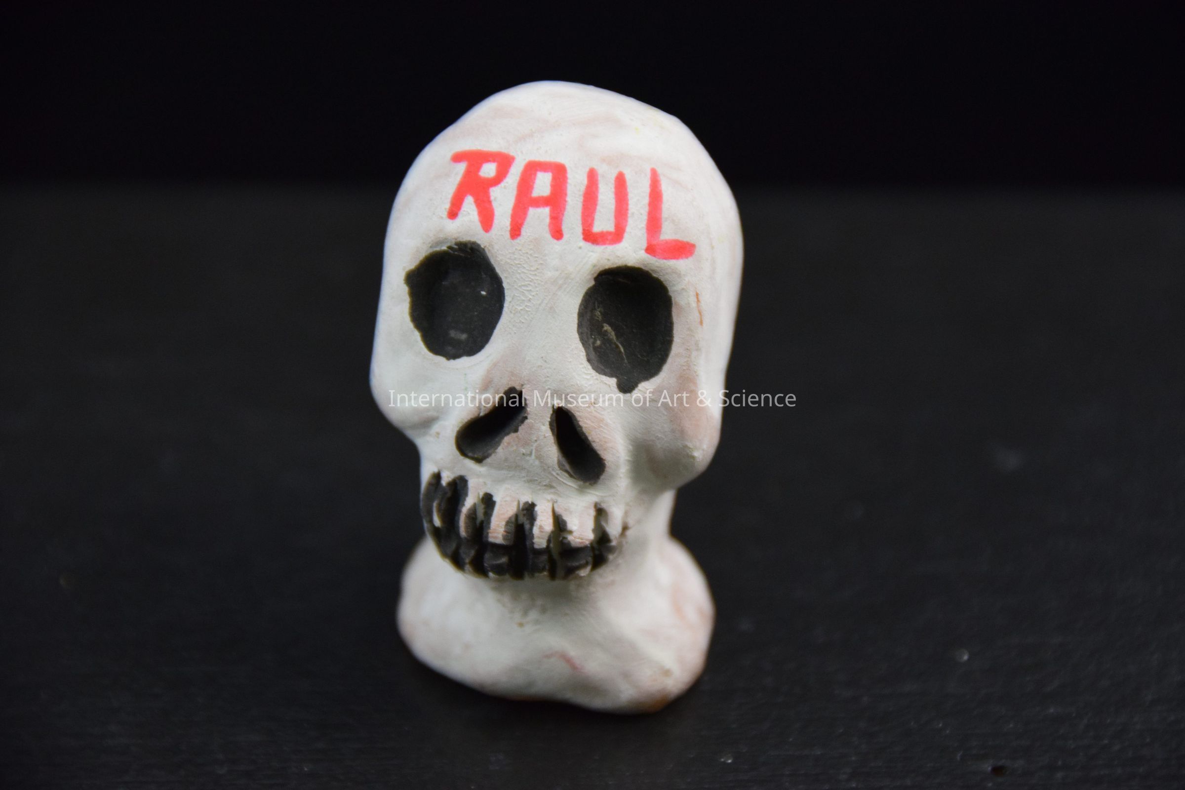 A ceramic figurine of a skull. The skull is painted in white with black detailing. "Raul" is written on the skull's forehead. It is part of a 19 piece set of offierings for a Day of the Dead altar.Made/Created