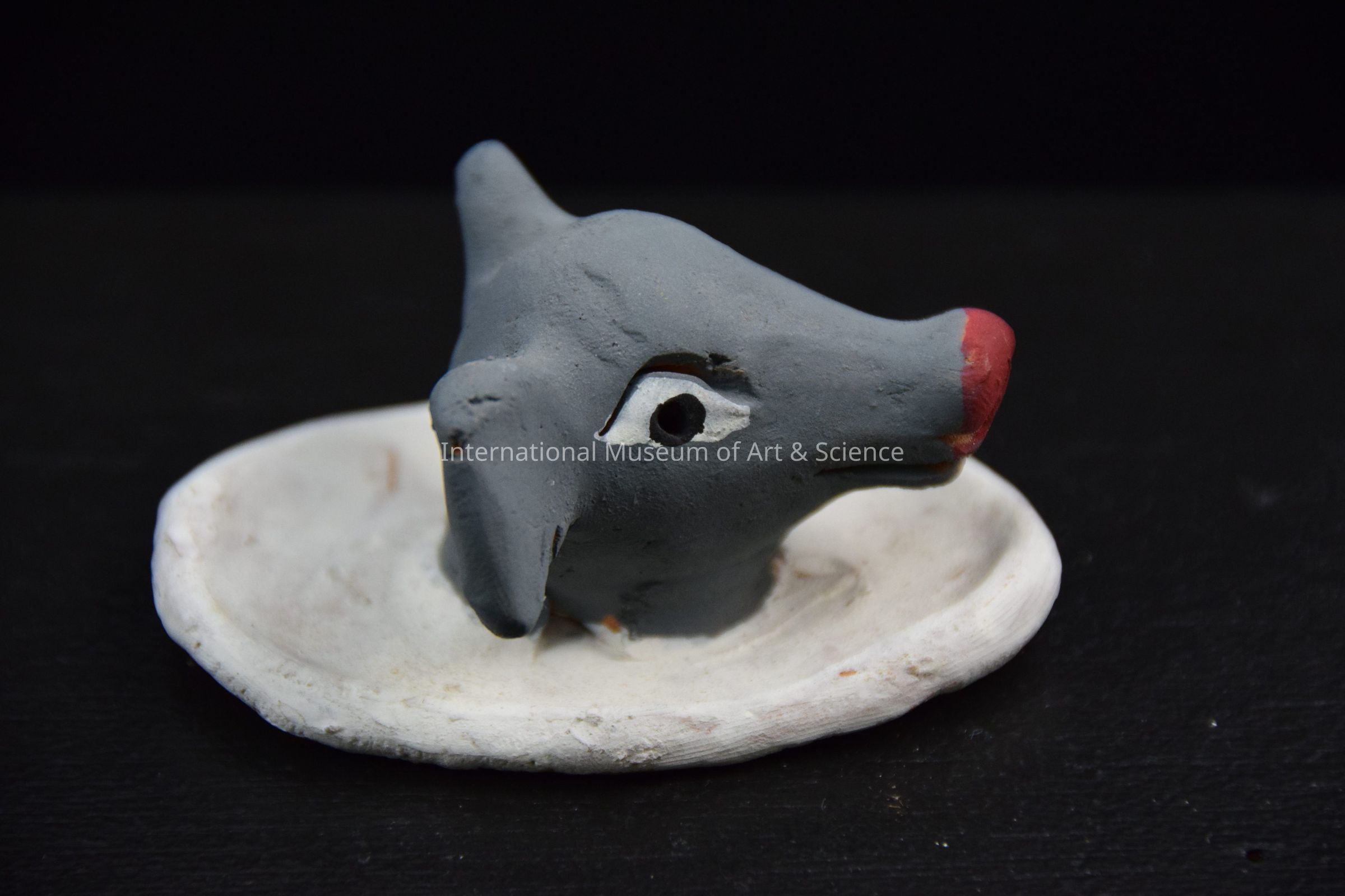 A ceramic figurine of a pig head on a platter. The pig head is grey in color and sits on a white platter. It is part of a 19 piece set of offerings for a Day of the Dead altar.Made/Created