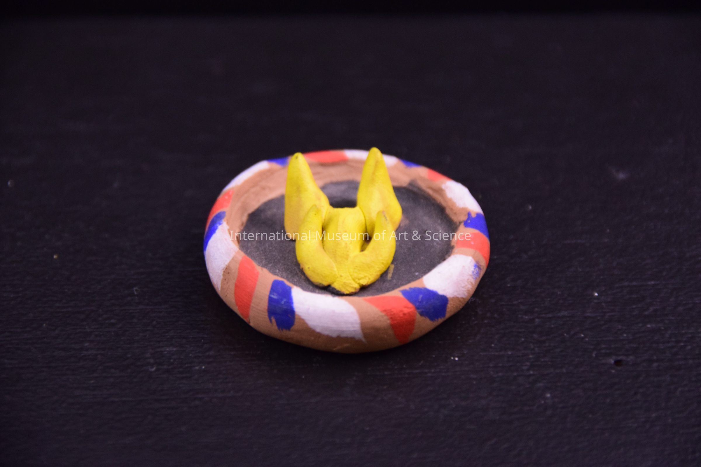 A ceramic figurine of a plate holding a roasted chiken. The plate is decorated in red, white, and blue stripes. The cooked chicken in yellow. It is part of a 19 piece set of offerings for a Day of the Dead altar.Made/Created
