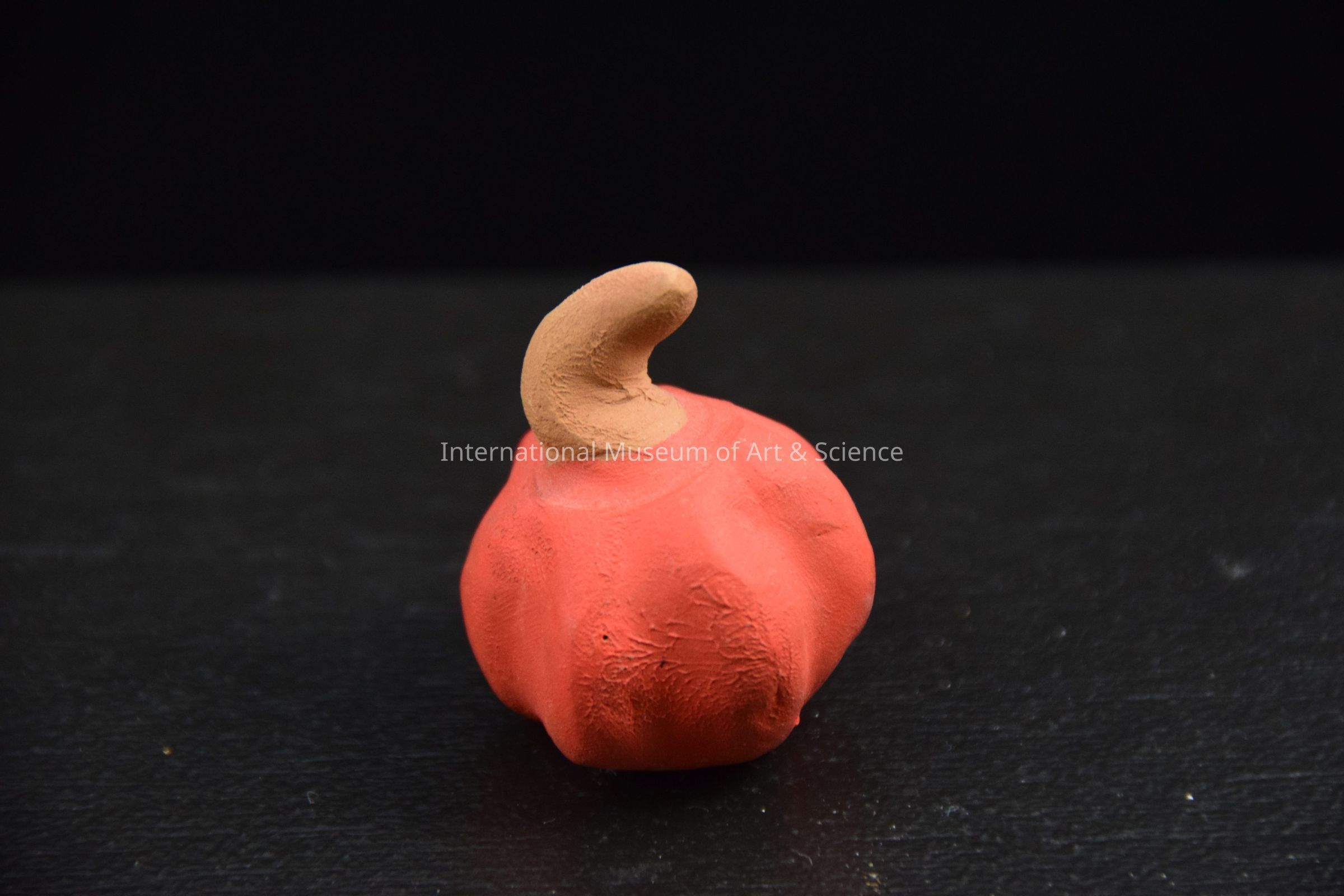 A ceramic figurine of a pumpkin. The pumpkin is dark orange in color with the stem unpainted. It is part of a 19 piece set of offerings for a Day of the Dead altar.Made/Created