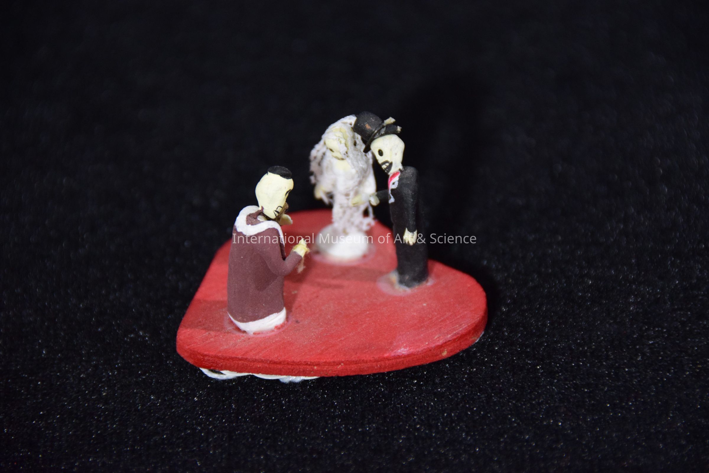 Day of the Dead Wedding. Red heart base made of wood. Three figures made of clay; appear to have heads attached with metal. Clothes painted on -priest has small black cap, brown rope with white trim, gold cross. Holding paper bible with red cross. Cotton string over other arm. Groom in black suit and hat with white and pink trim. Bride in white with white cotton veil attached. Faces painted on in black.
