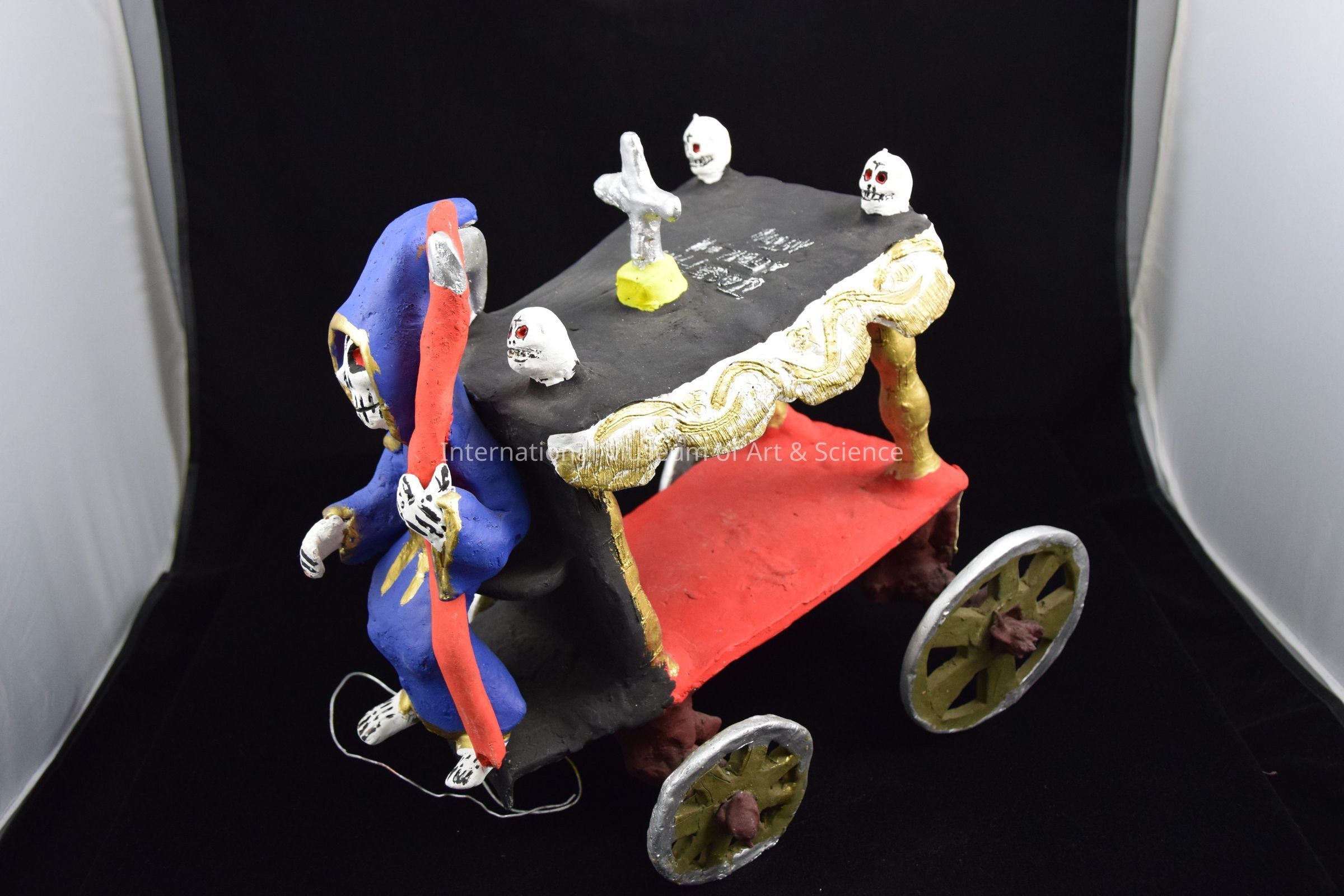 A ceramic figurine of a Death cart. The base of the cart is red and sits on a set of four ceramic wheels. The canopy is held up by two gold colored coluemns. The canpoy is black and has skulls on each of the corners and a silver cross in the center. A skeletal Father Time sits in the front seat. He is wearing a blue hooded robe and carrys a red with silver scythe.Dimensions