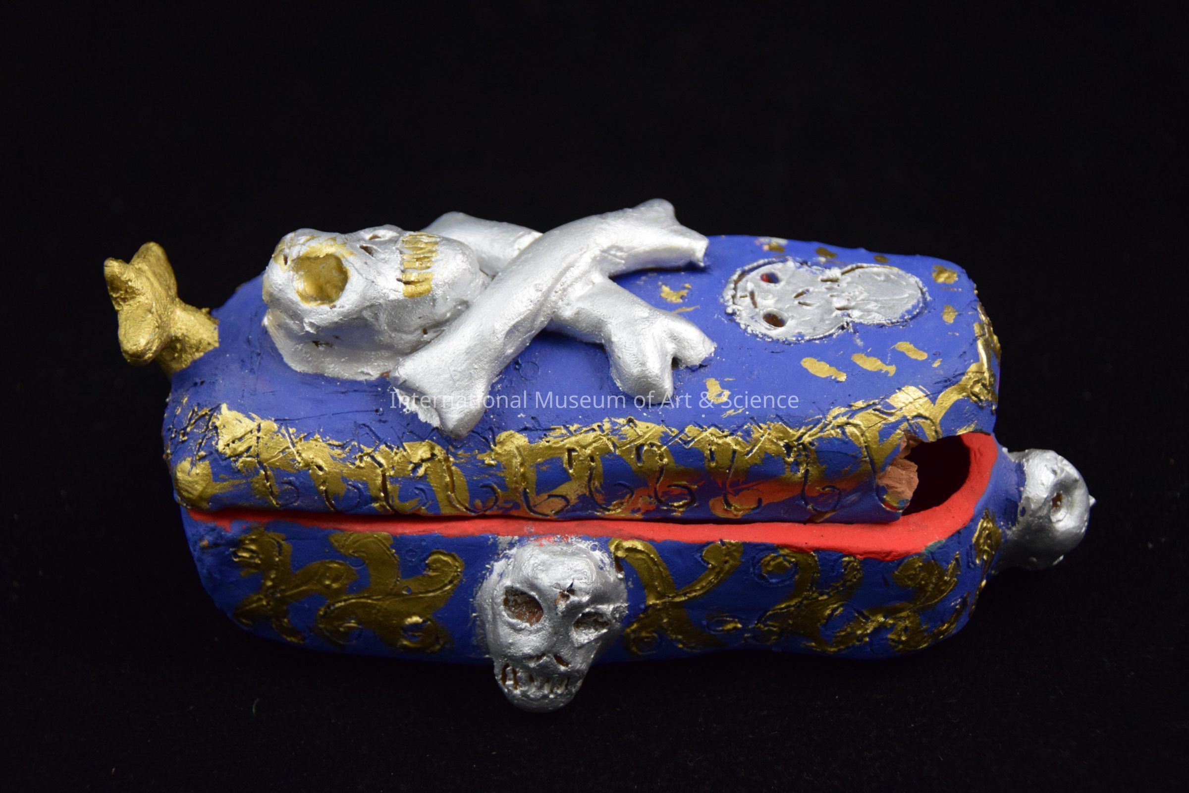 A ceramic figurine of a casket. The casket has a red interior and a blue exterior decoreated in silver skulls and gold designs. It is part of a "Death Cart" scene with a hearse cart/wagaon, horses, a casket, and father time. A figurine of a man fits inside of the casket.Dimensions