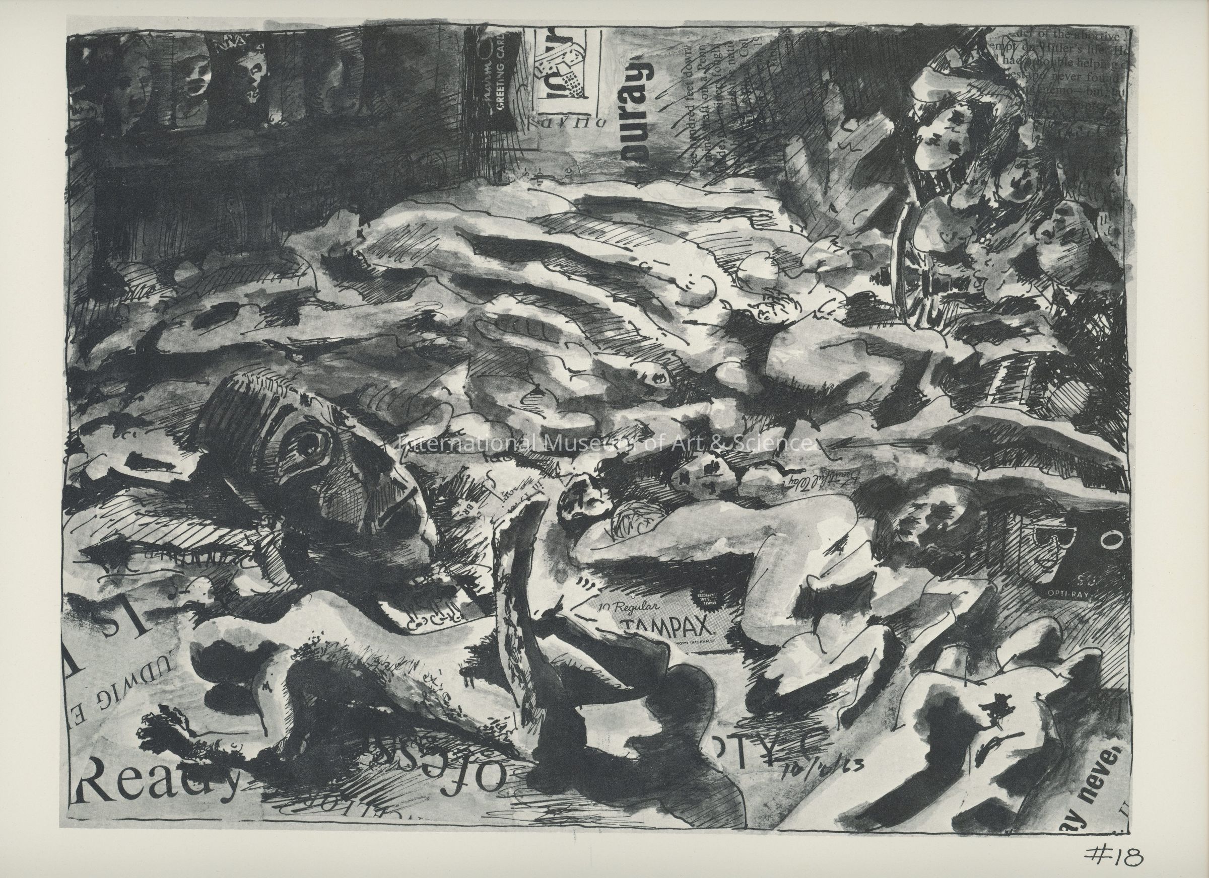 A offset lithograph. This print is part of a 169 piece set entitled: Death is All the Time. The prints are divided into two parts and then sub-grouped again. Part I: Events (Drawings 1 - 52). Prints 11 through 20 are entitled: War Was the Beginning.
