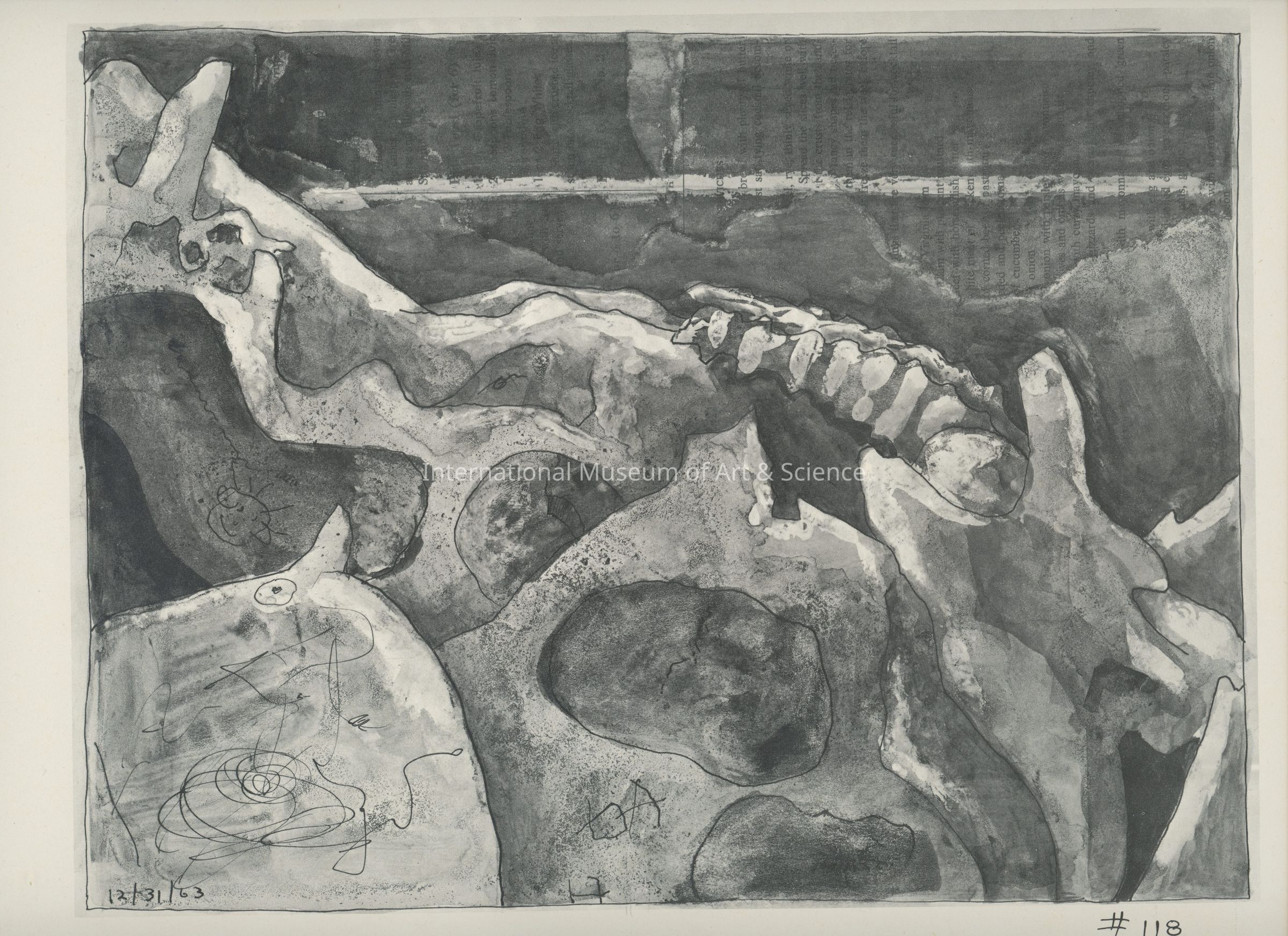 A offset lithograph. This print is part of a 169 piece set entitled: Death is All the Time. The prints are divided into two parts and then sub-grouped again. Part II: Aftermath (Drawings 53 - 169). Prints 91 through 131 are entitled: Nox-Dies or "Night-Dies". 106 through 131 are sub-titled: Night (Nox).