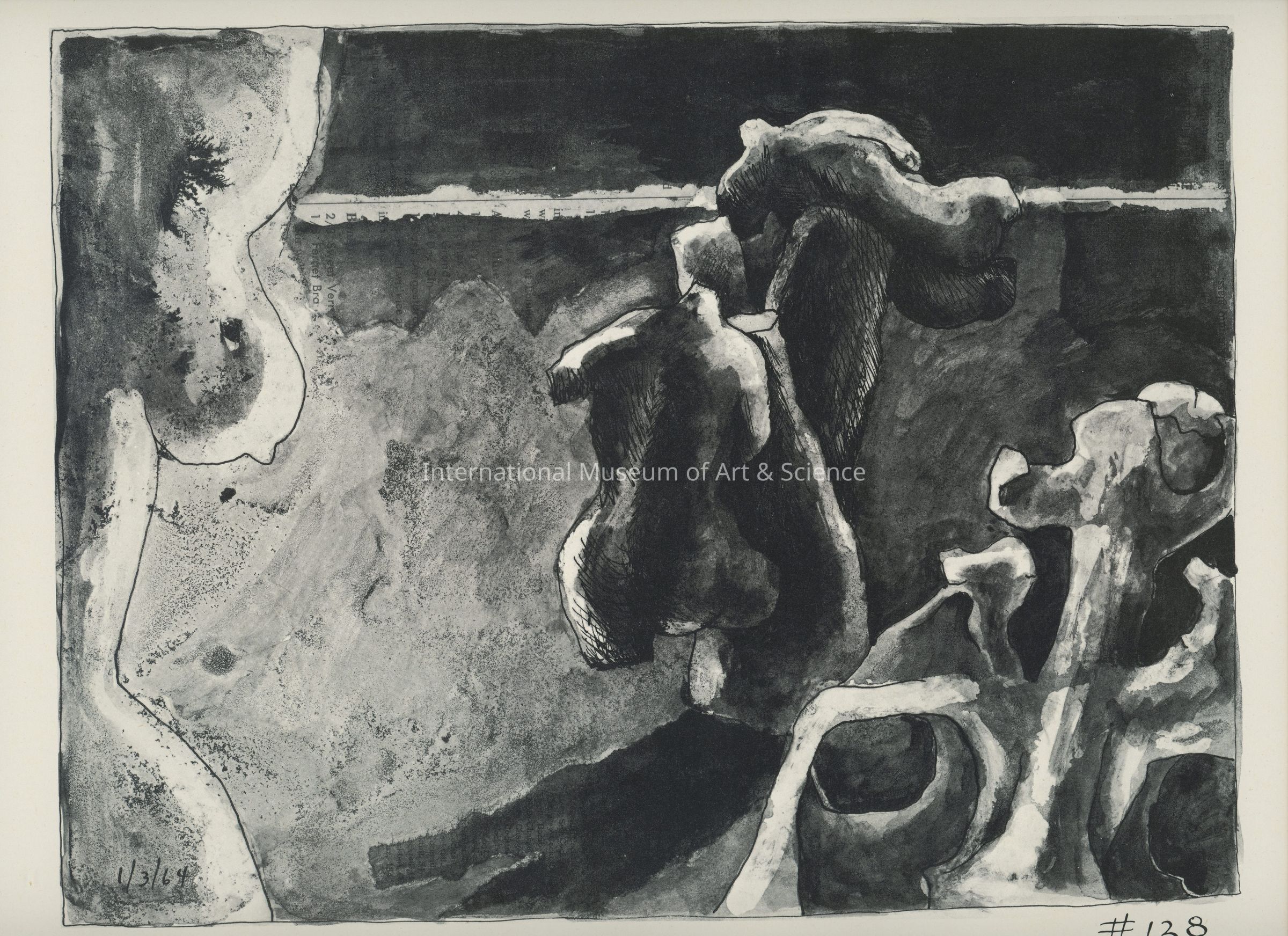 A offset lithograph. This print is part of a 169 piece set entitled: Death is All the Time. The prints are divided into two parts and then sub-grouped again. Part II: Aftermath (Drawings 53 - 169). Prints 91 through 131 are entitled: Nox-Dies or "Night-Dies". 106 through 131 are sub-titled: Night (Nox).