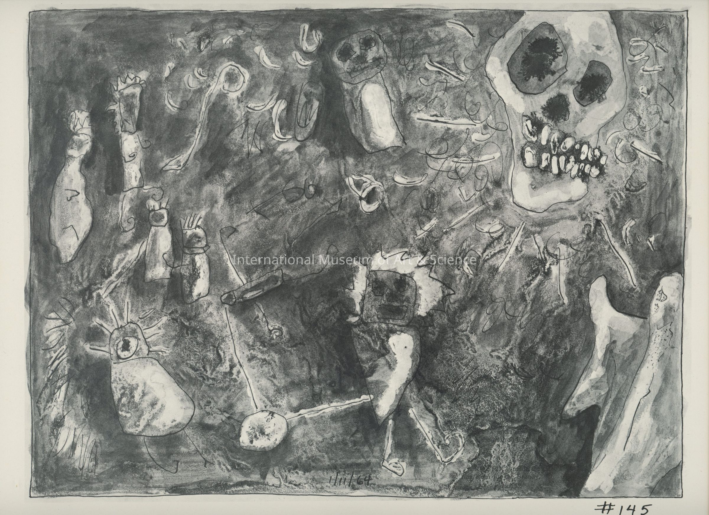 A offset lithograph. This print is part of a 169 piece set entitled: Death is All the Time. The prints are divided into two parts and then sub-grouped again. Part II: Aftermath (Drawings 53 - 169). Prints 132 through 151 are entitled: A Child's Nightmares of War.