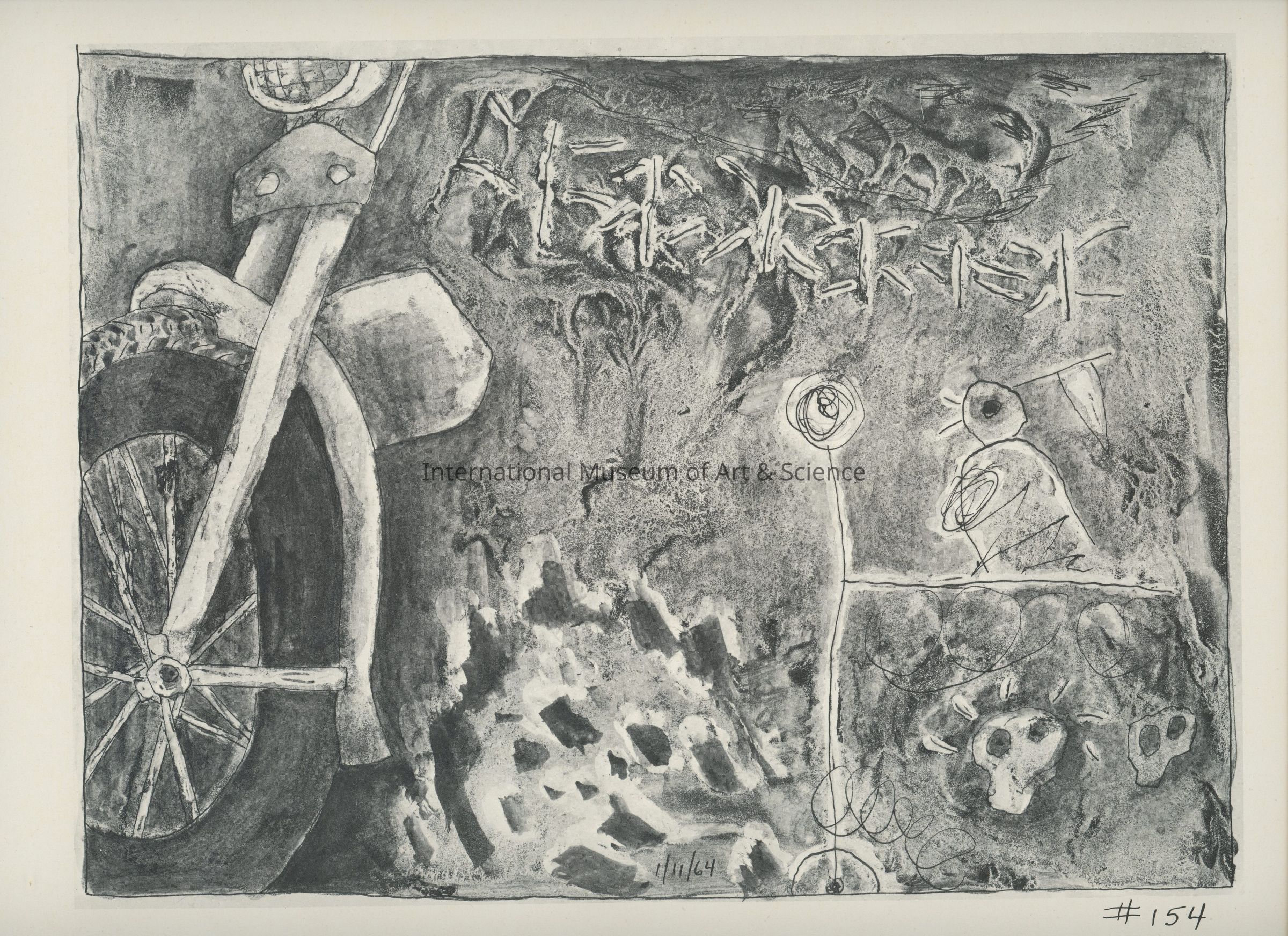 A offset lithograph. This print is part of a 169 piece set entitled: Death is All the Time. The prints are divided into two parts and then sub-grouped again. Part II: Aftermath (Drawings 53 - 169). Prints 152 through 158 are entitled: Death in the Desert.