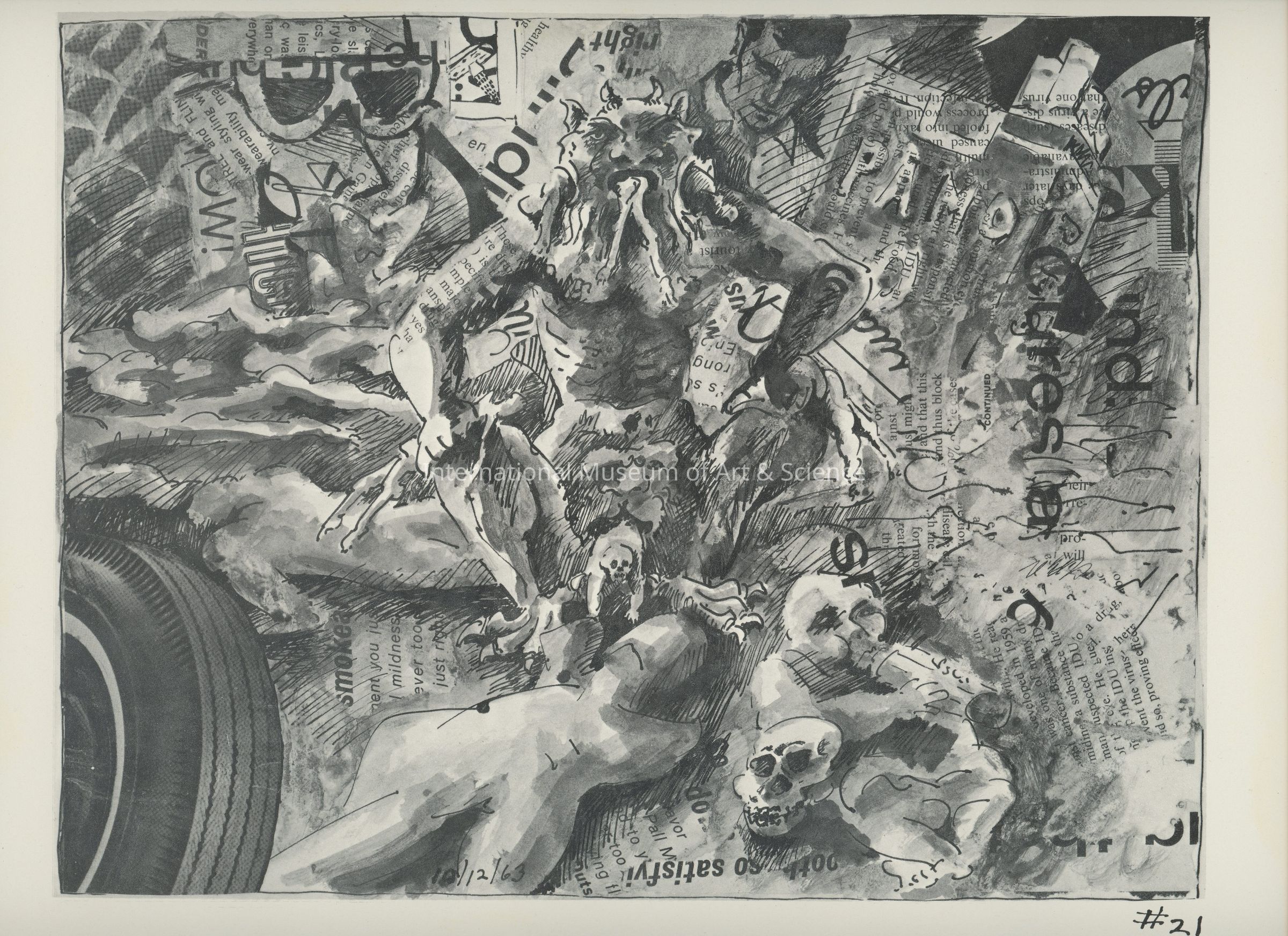 A offset lithograph. This print is part of a 169 piece set entitled: Death is All the Time. The prints are divided into two parts and then sub-grouped again. Part I: Events (Drawings 1 - 52). Prints 21 through 26 are entitled: War Limbo.