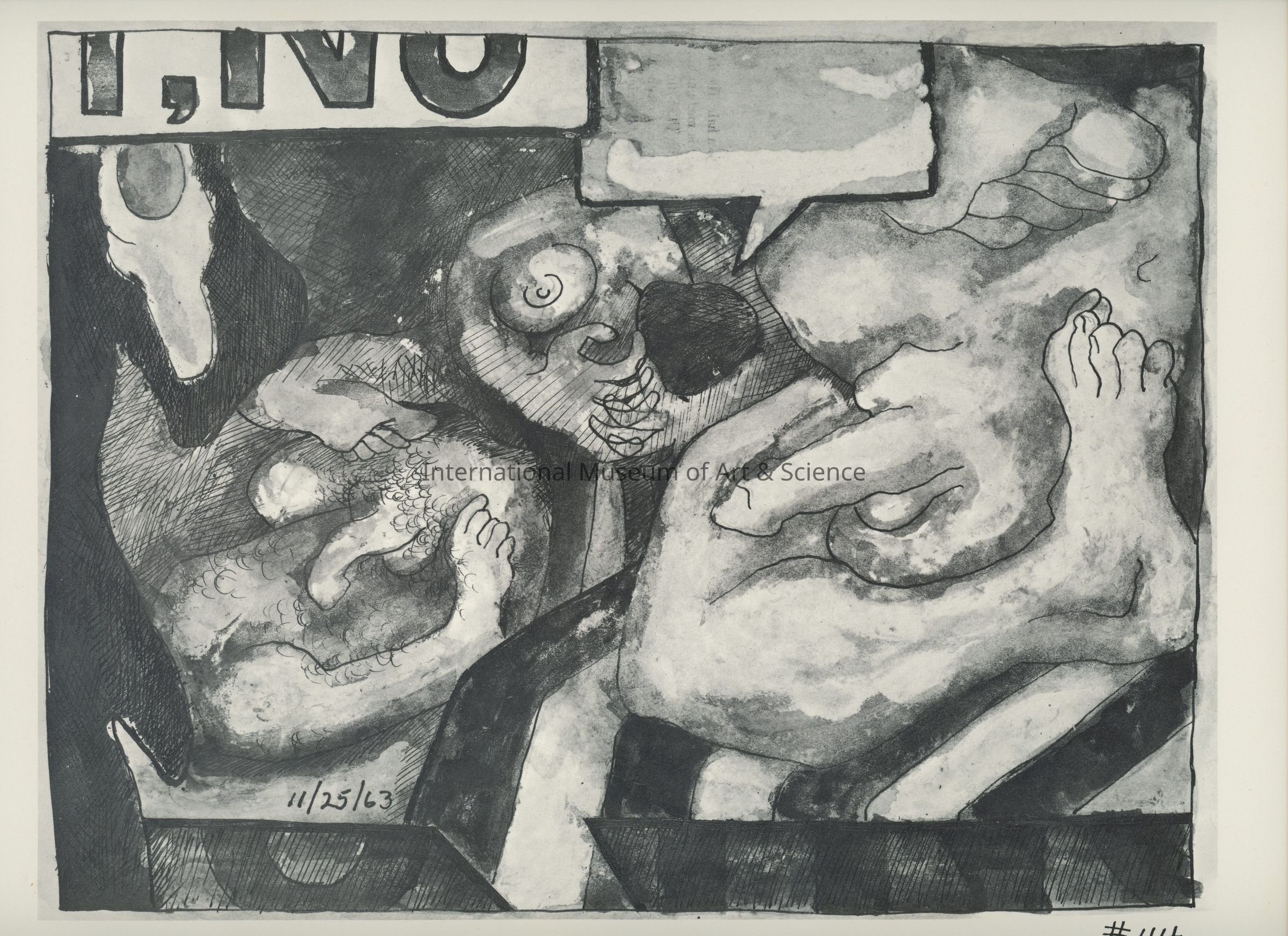 A offset lithograph. This print is part of a 169 piece set entitled: Death is All the Time. The prints are divided into two parts and then sub-grouped again. Part I: Events (Drawings 1 - 52). Prints 36 through 52 are entitled: Death of A Young Man Murdered (JFK). Prints 40 through 44 subtitled: "Oh No".