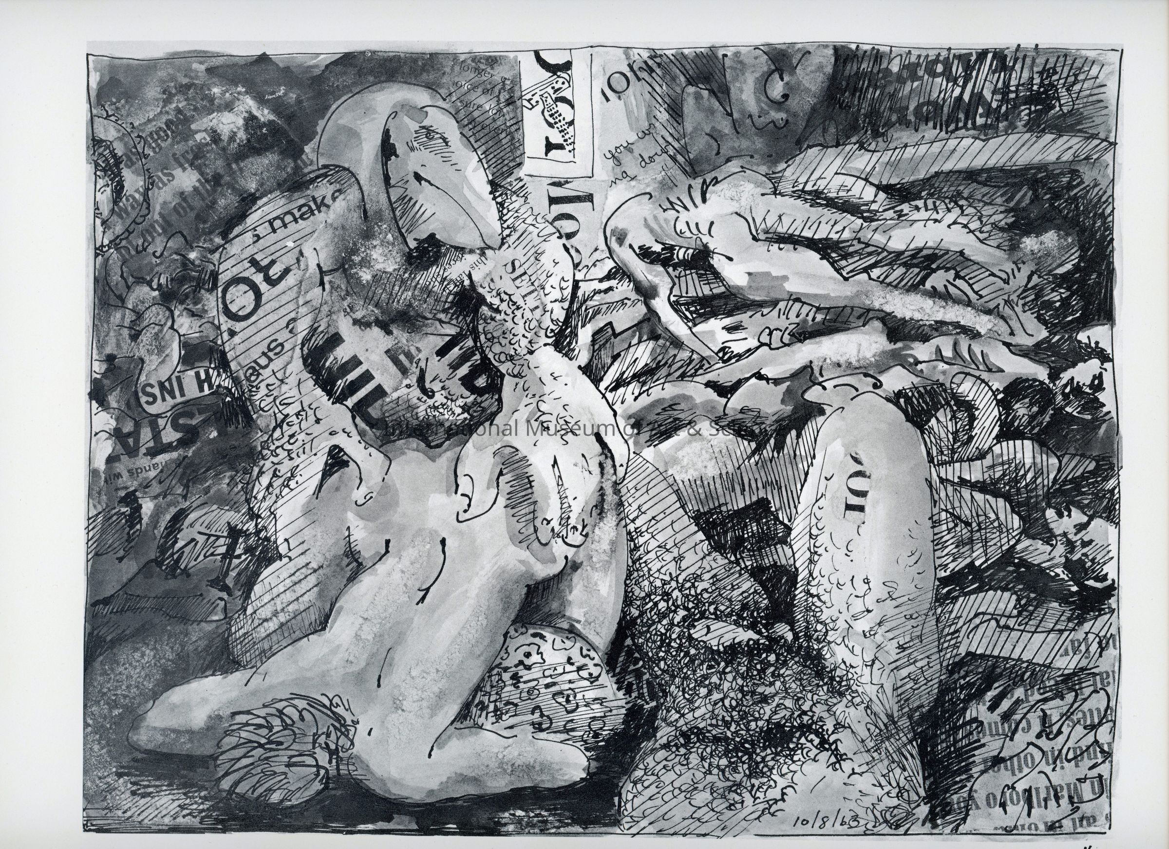 A offset lithograph. This print is part of a 169 piece set entitled: Death is All the Time. The prints are divided into two parts and then sub-grouped again. Part I: Events (Drawings 1 - 52). Prints 11 through 20 are entitled: War Was the Beginning.