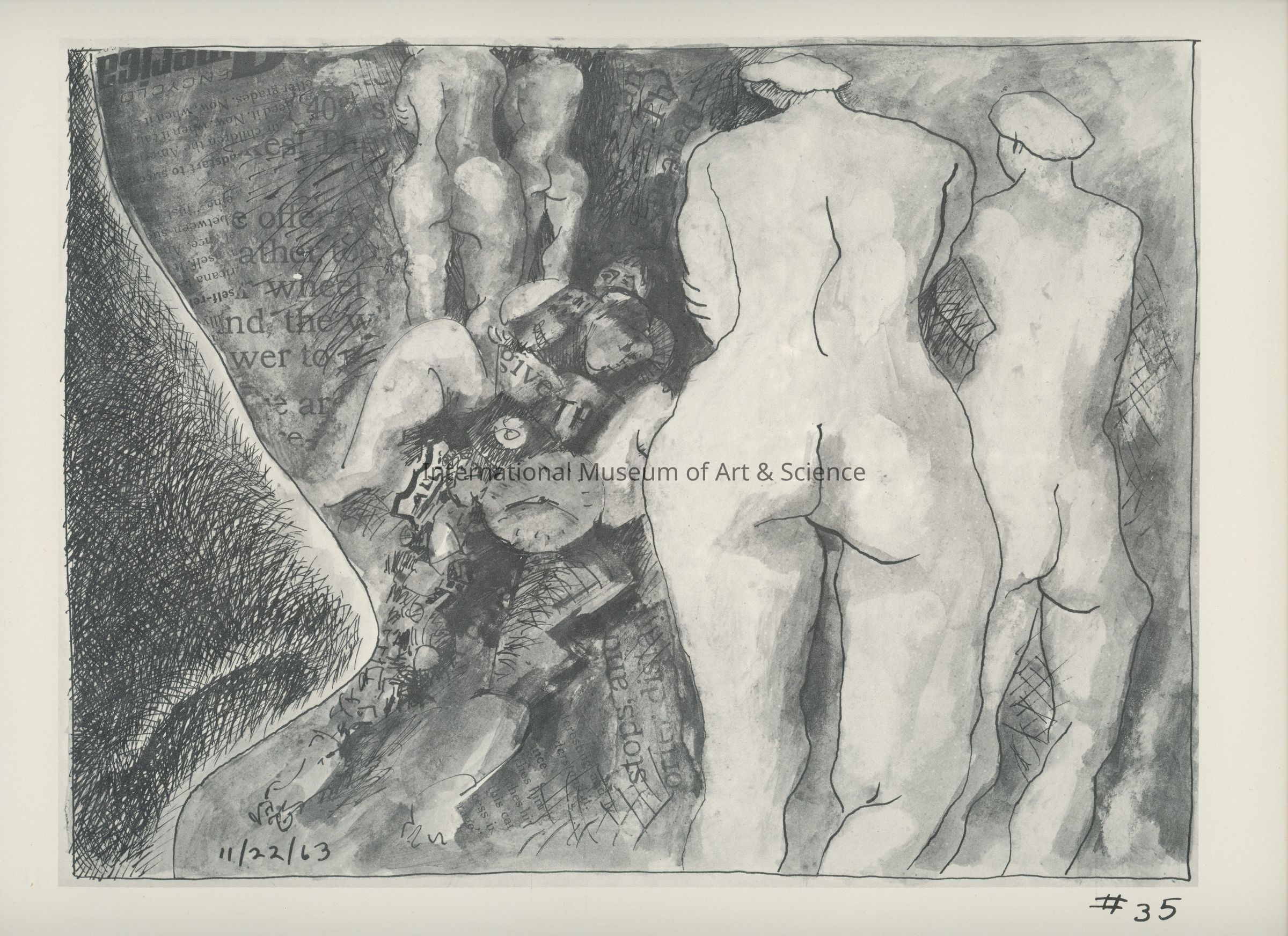 A offset lithograph. This print is part of a 169 piece set entitled: Death is All the Time. The prints are divided into two parts and then sub-grouped again. Part I: Events (Drawings 1 - 52). Prints 33 through 35 are entitled: A Short Pause of Peace.