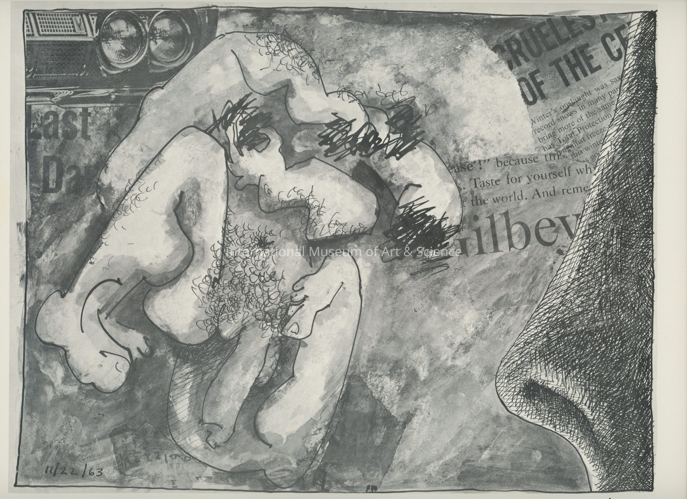 A offset lithograph. This print is part of a 169 piece set entitled: Death is All the Time. The prints are divided into two parts and then sub-grouped again. Part I: Events (Drawings 1 - 52). Prints 36 through 52 are entitled: Death of A Young Man Murdered (JFK). Prints 36 through 37 subtitled: November 22, 1963.