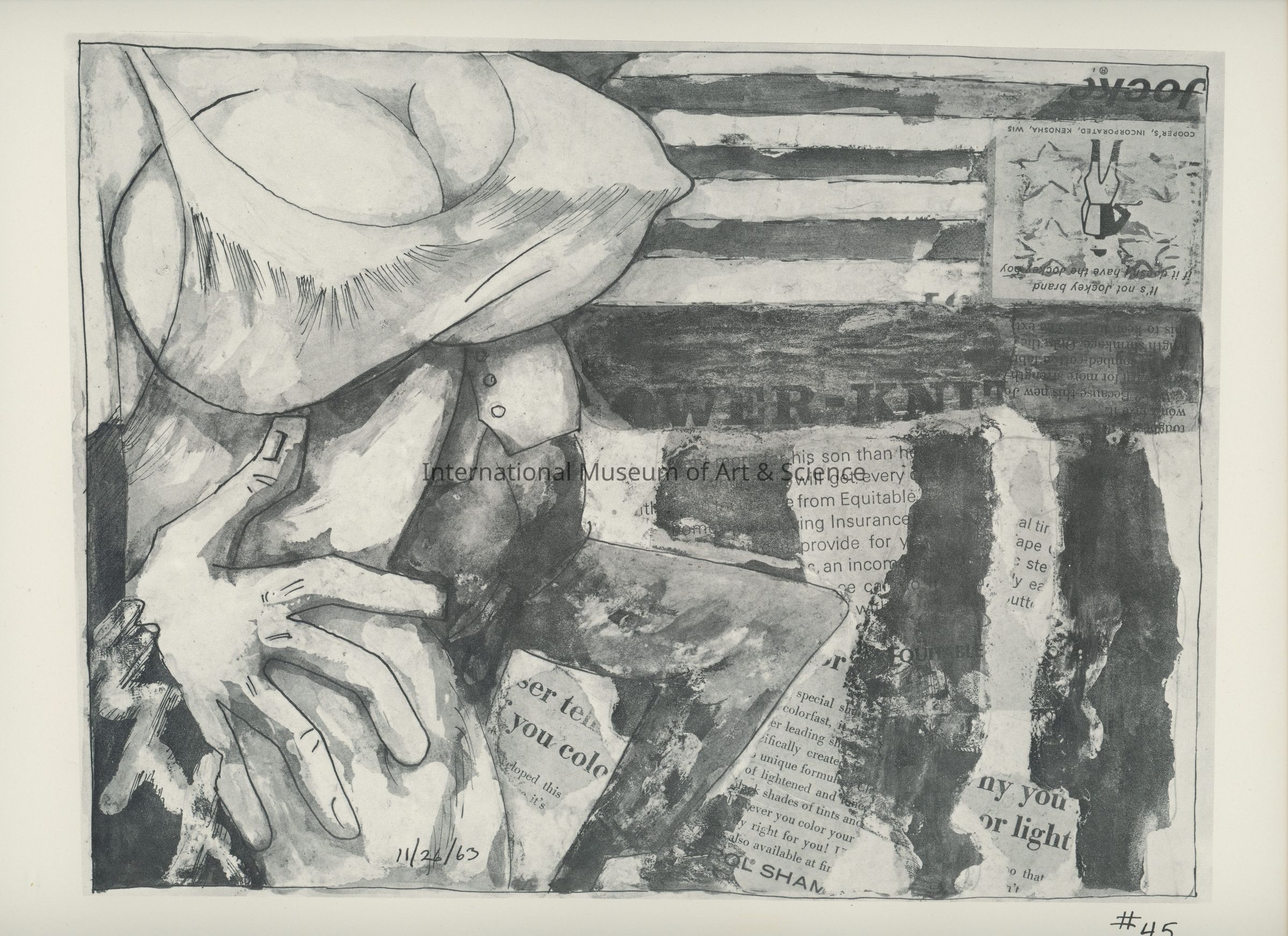 A offset lithograph. This print is part of a 169 piece set entitled: Death is All the Time. The prints are divided into two parts and then sub-grouped again. Part I: Events (Drawings 1 - 52). Prints 36 through 52 are entitled: Death of A Young Man Murdered (JFK). Prints 45 through 49 subtitled: The Nation Mourns.