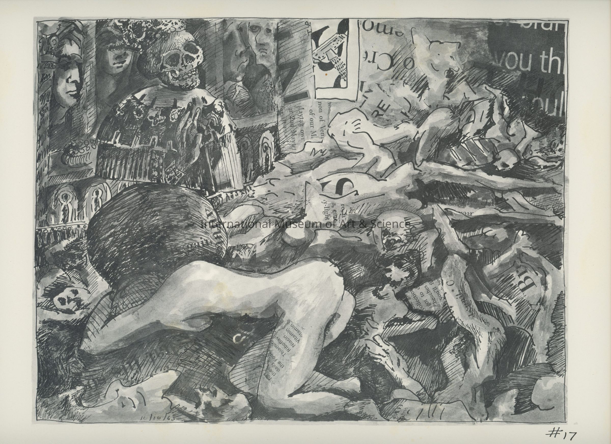 A offset lithograph. This print is part of a 169 piece set entitled: Death is All the Time. The prints are divided into two parts and then sub-grouped again. Part I: Events (Drawings 1 - 52). Prints 11 through 20 are entitled: War Was the Beginning.