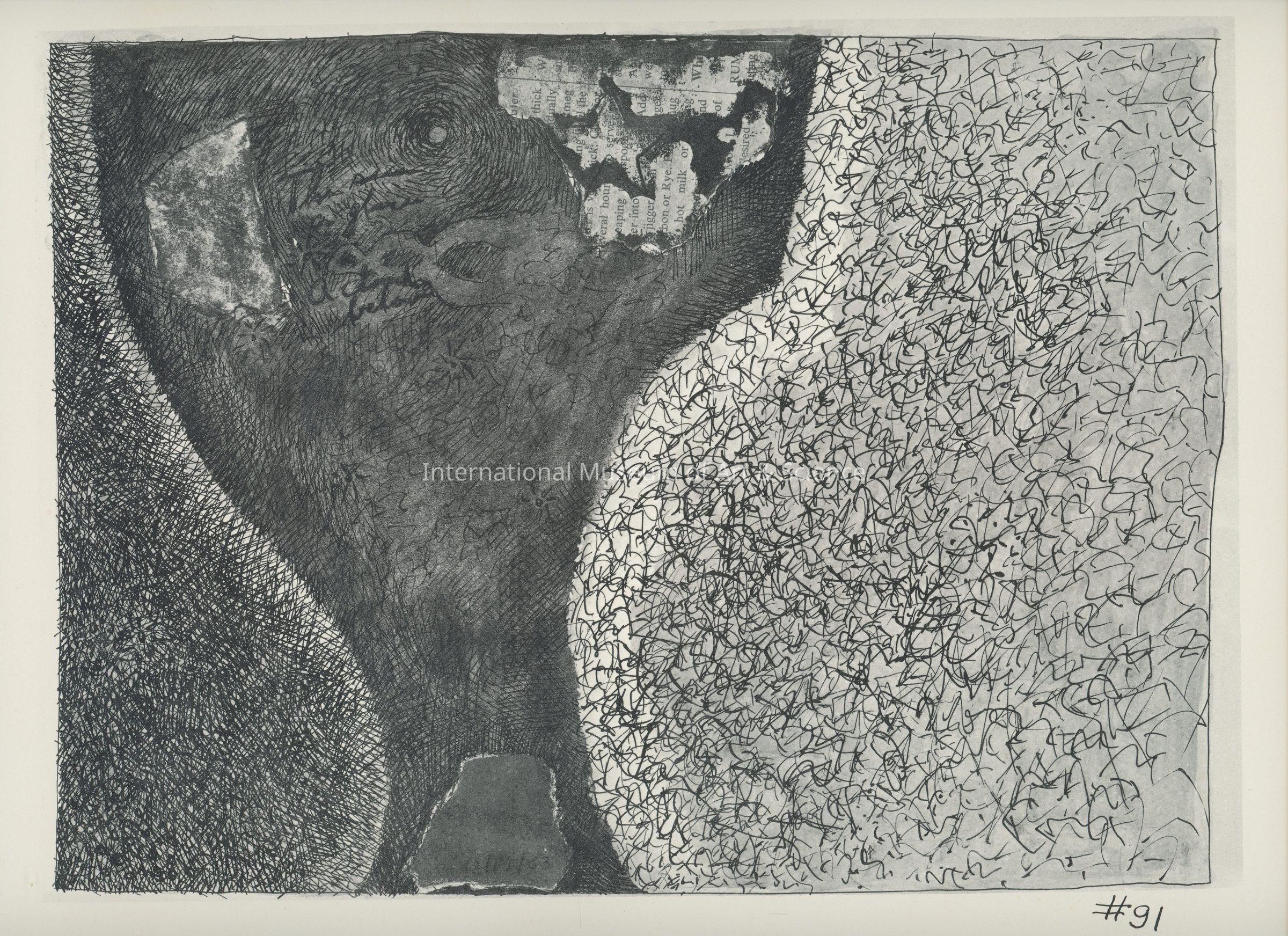 A offset lithograph. This print is part of a 169 piece set entitled: Death is All the Time. The prints are divided into two parts and then sub-grouped again. Part II: Aftermath (Drawings 53 - 169). Prints 91 through 131 are entitled: Nox-Dies or "Night-Dies". 91 through 95 are sub-titled: Introduction.