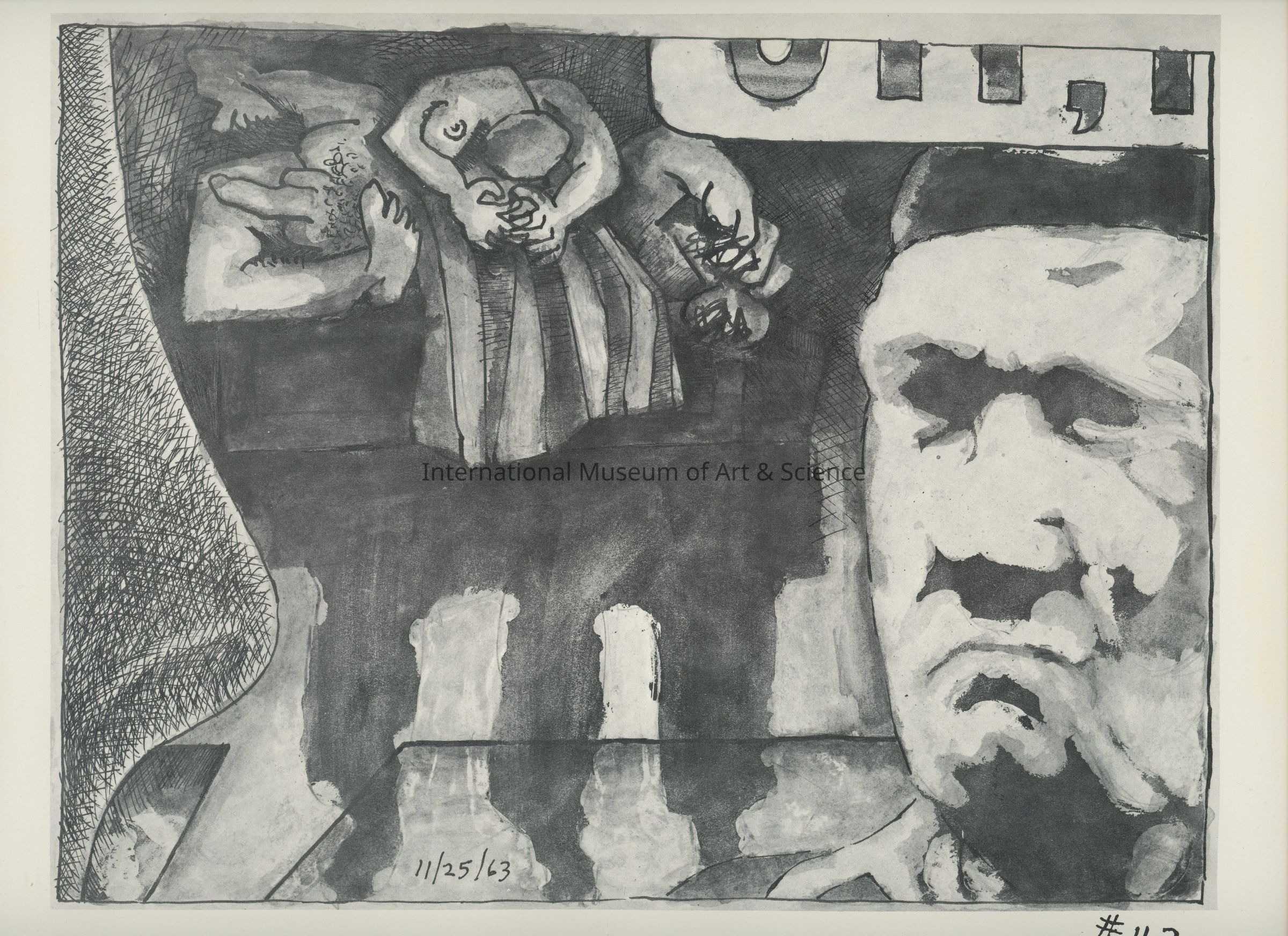 A offset lithograph. This print is part of a 169 piece set entitled: Death is All the Time. The prints are divided into two parts and then sub-grouped again. Part I: Events (Drawings 1 - 52). Prints 36 through 52 are entitled: Death of A Young Man Murdered (JFK). Prints 40 through 44 subtitled: "Oh No".